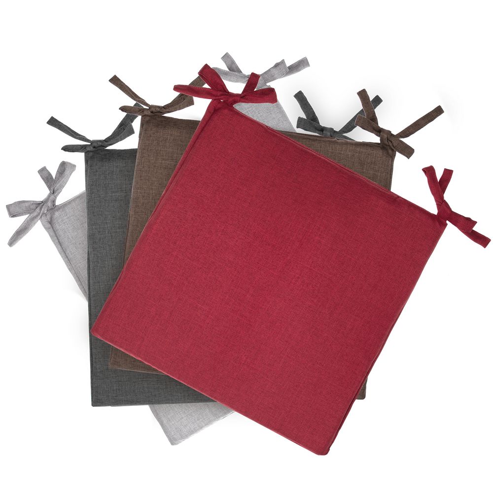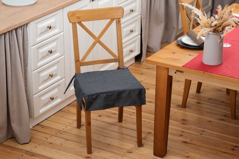 Поролон внутри подушки делает сидение мягче, а спускающиеся по сторонам клапаны сразу придают стулу более элегантный вид. Износостойкая ткань, имитирующая лен, обработана пропиткой от грязи и воды, что делает ее применение для кухни и дома практичным, а уход — легким.