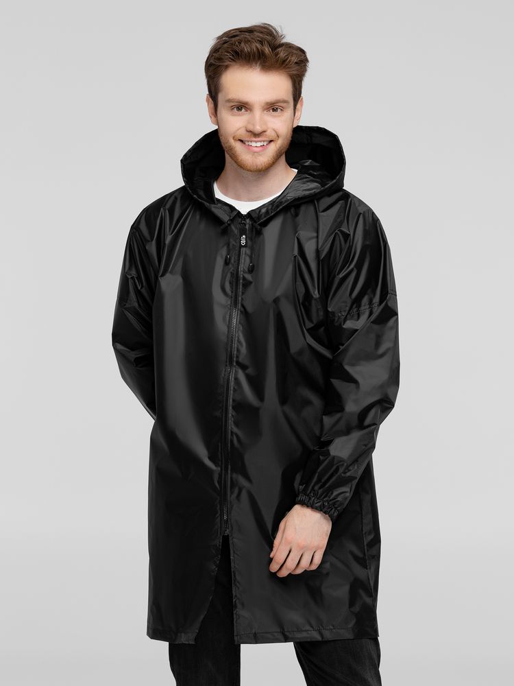 Плащ-дождевик из ткани таффета на молнии с капюшоном. Складывается в мешочек — удобно брать с собой.
