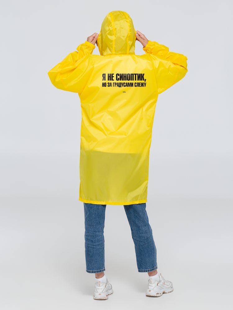 Предсказывать погоду трудно. А непогоду — легко! Если на улице тучи, дождь и ветер — это явный признак того, что надо захватить с собой дождевик. И лучше желтый. Вдруг это вызовет солнце!Плащ-дождевик из ткани таффета на молнии с капюшоном. Складывается в мешочек — удобно брать с собой.