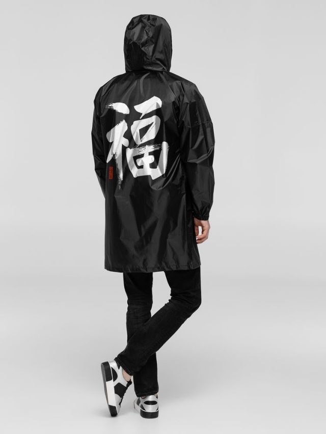 Иероглифы коллекции «Вечные ценности» выполнены в жанре каллиграфии на древнекитайском диалекте мандарин. Плавные линии символизируют внутренний баланс и фокусировку на главных жизненных ориентирах.Плащ-дождевик из ткани таффета на молнии с капюшоном. Складывается в мешочек — удобно брать с собой.