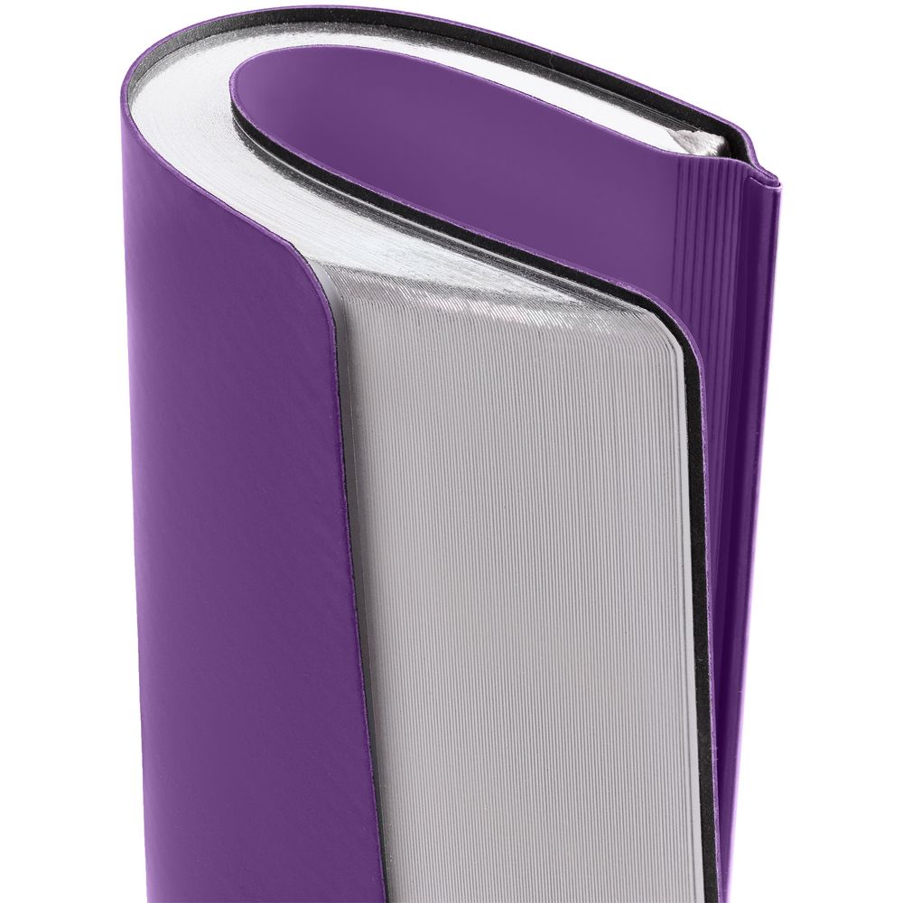 Ежедневник с гибкой обложкой и металлическим корешком, выполнен из материала Soft Touch, фиолетовый UU, дополнен серебристым обрезом блока и ляссе.