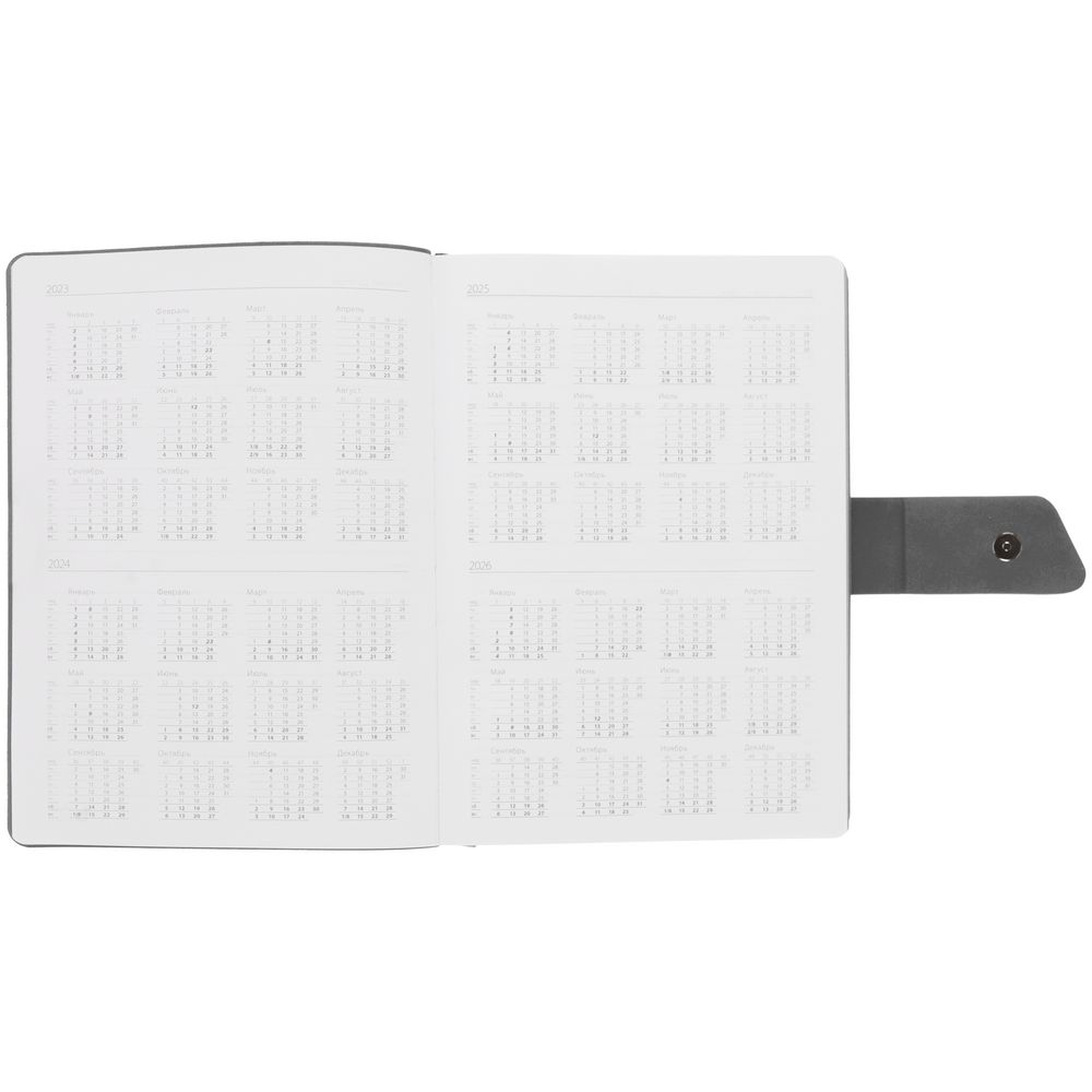 Ежедневник с гибкой обложкой, выполнен из материала La Fite, черный АА и Nubuck, серый СС, дополнен серым ляссе и хлястиком на кнопке.