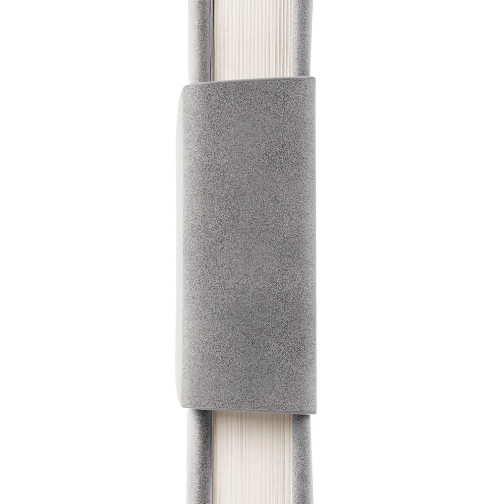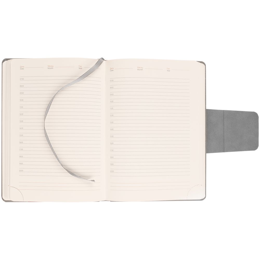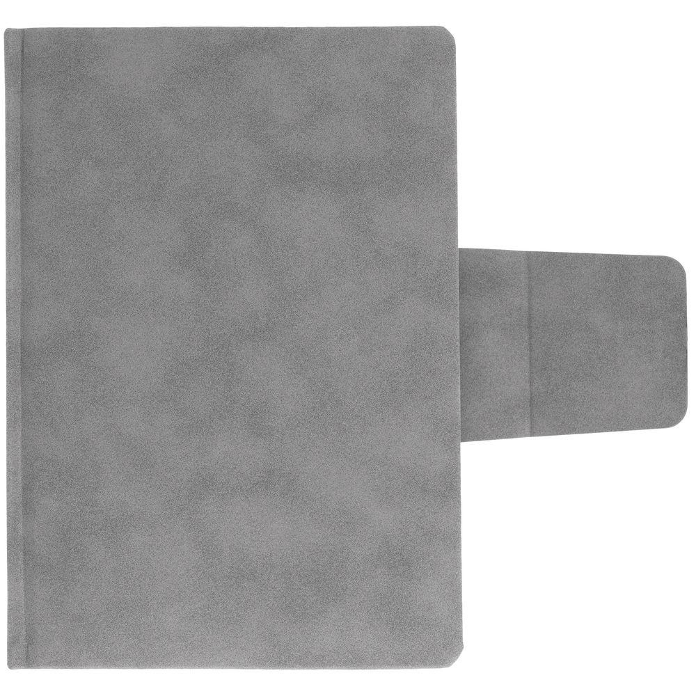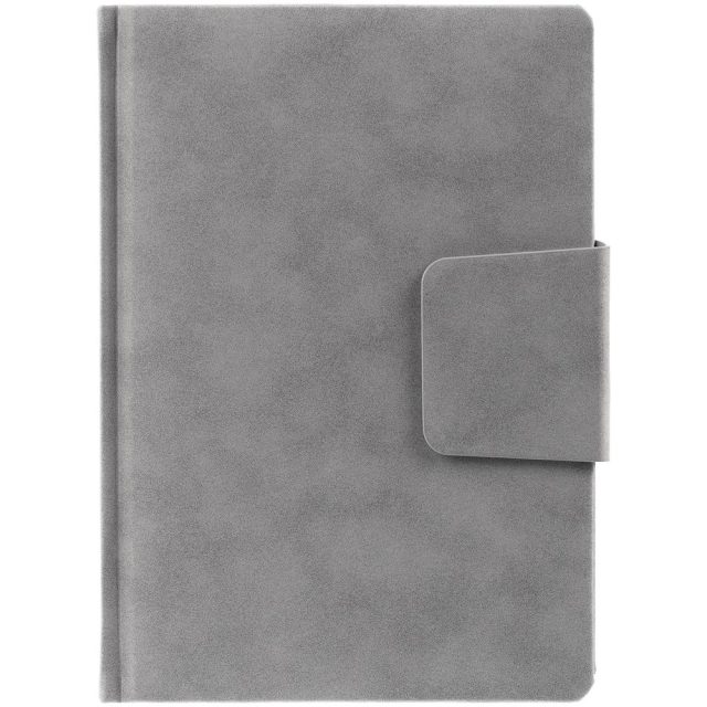 Ежедневник с твердой обложкой c поролоном, выполнен из материала Nubuck, серый СС, дополнен капталом и ляссе серого цвета. Застежка — хлястик на магните.