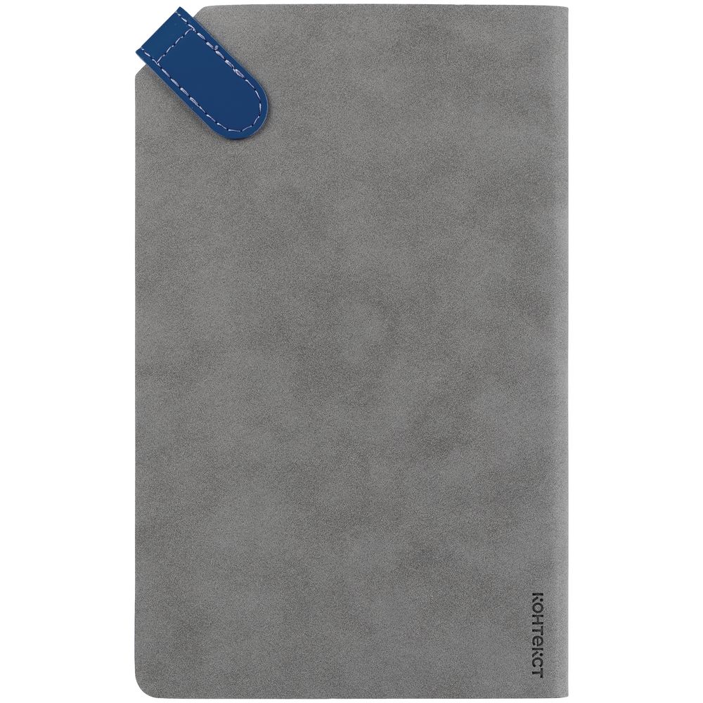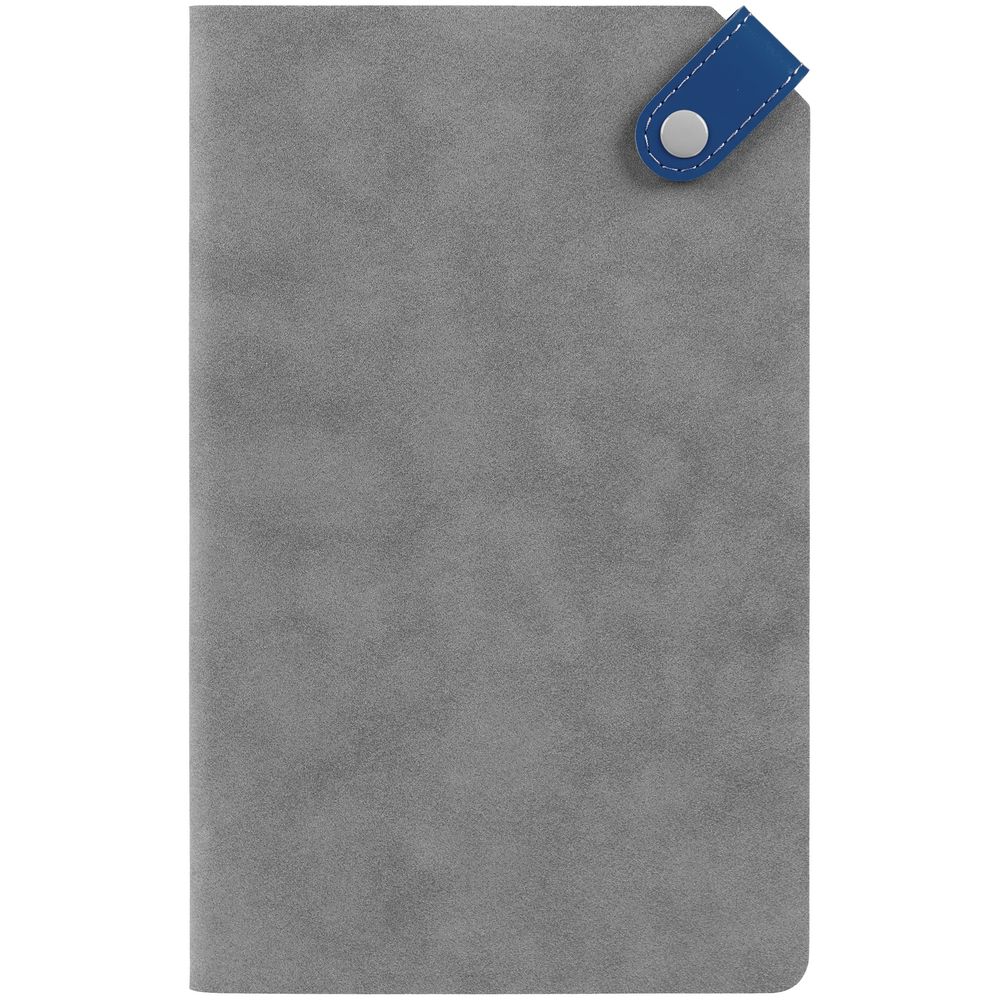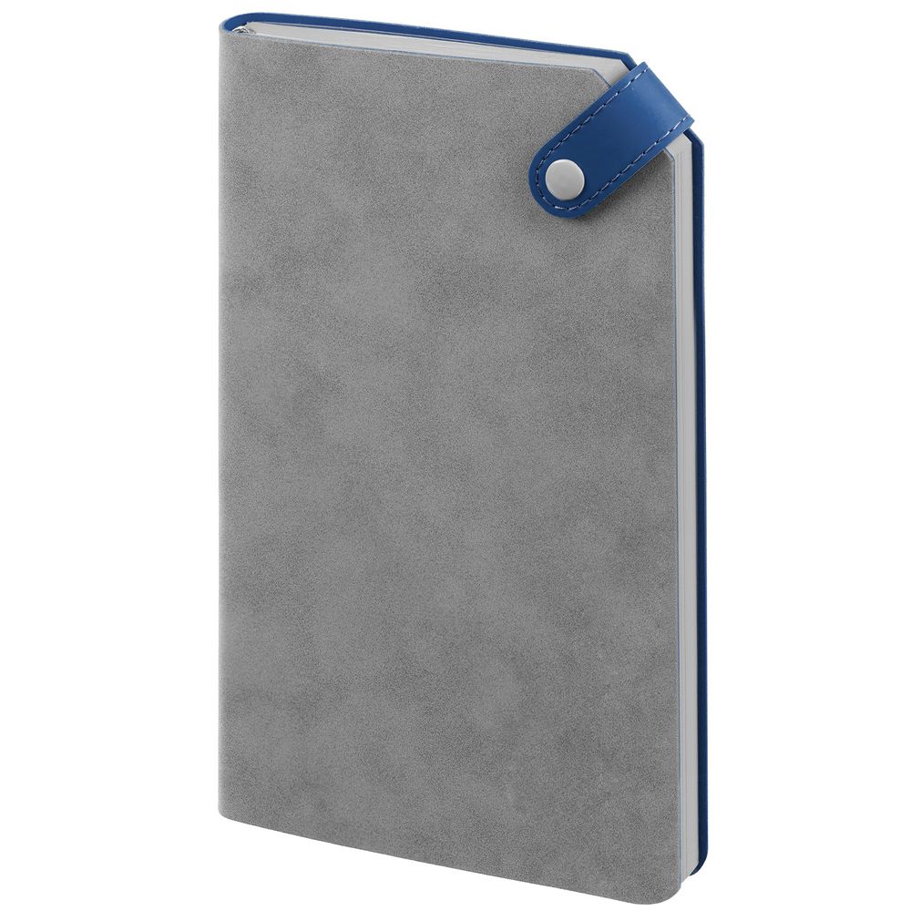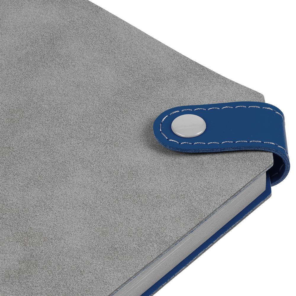 Ежедневник с гибкой обложкой, выполнен из материала Nubuck, серый СС и Soft Touch Ultra, синий; дополнен серым ляссе и хлястиком на кнопке.