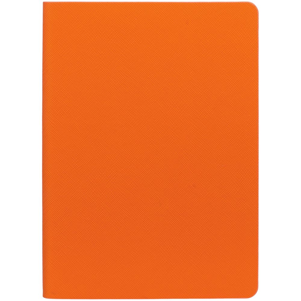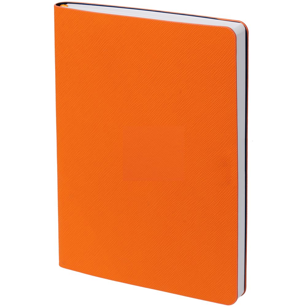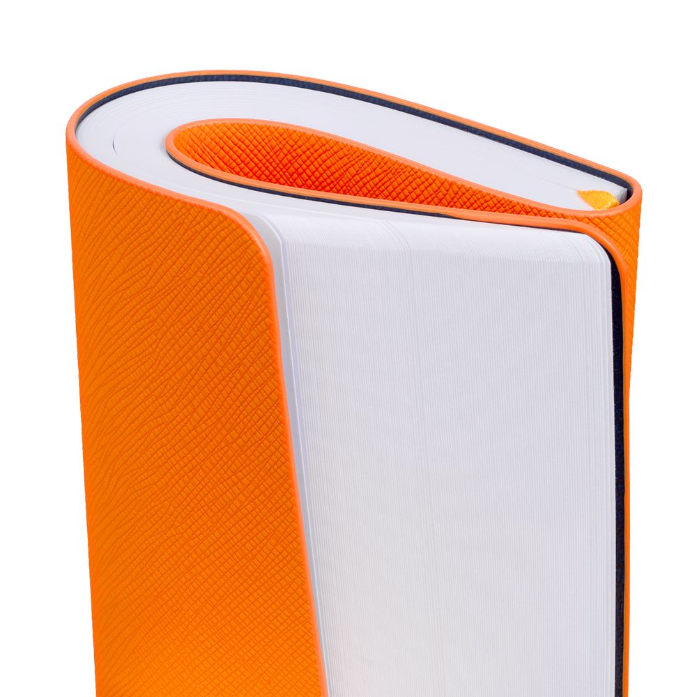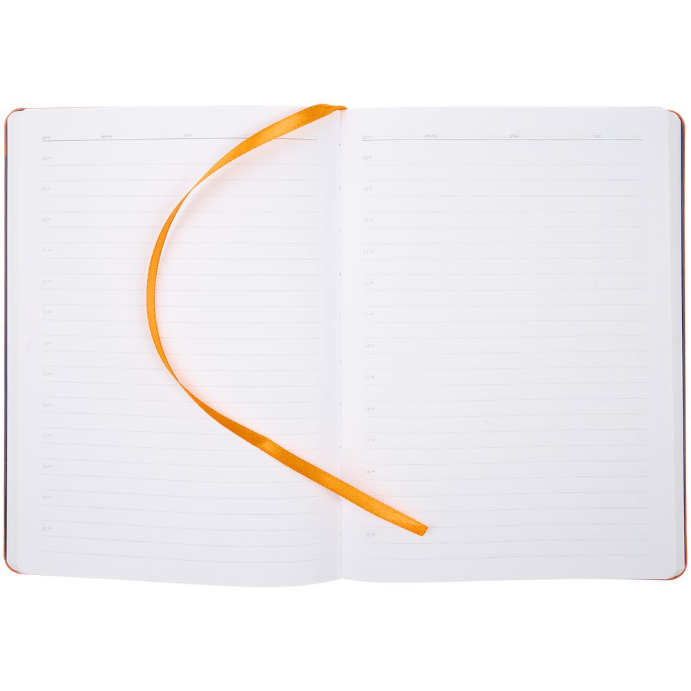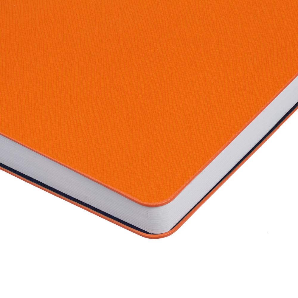 Ежедневник с гибкой обложкой, выполнен из материалов Nice Touch, оранжевый ОО и Bilberry, темно-синий ХХ (внутренний материал), дополнен ляссе в цвет обложки.