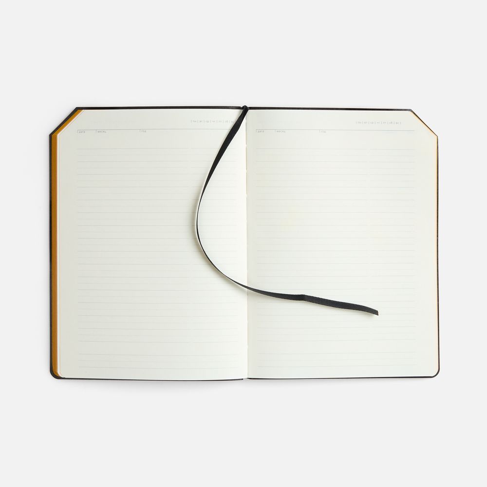 Ежедневник с гибкой обложкой, выполнен из материала Espresso, дополнен ляссе черного цвета и хлястиком на кнопке.