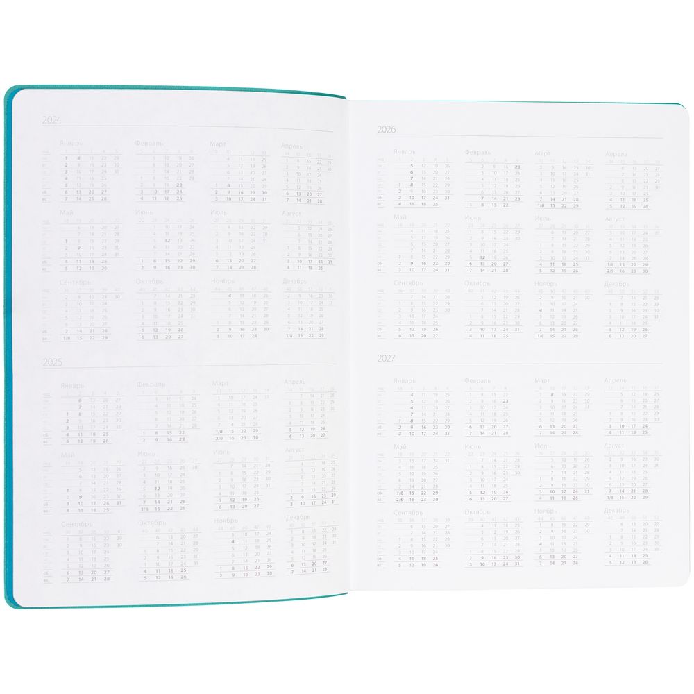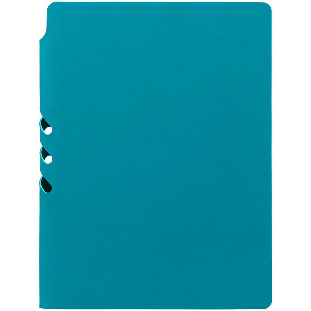 Гибкая обложка выполнена из материала Soft Touch, цвет морской волны II и Latte, цвет морской волны II (внутренняя часть обложки). Внутри корешка — специальное место для крепления ручки размером до 15х1 см.