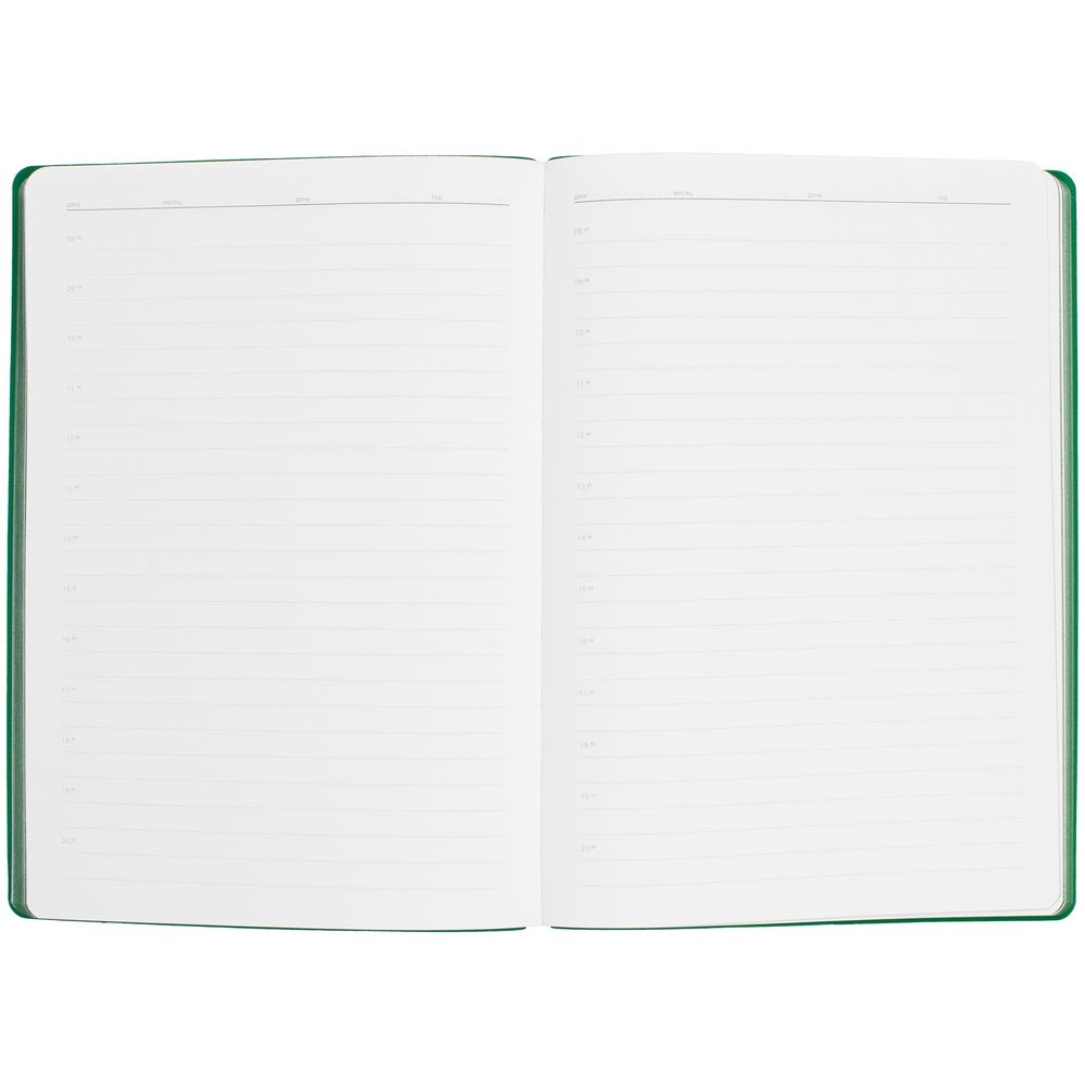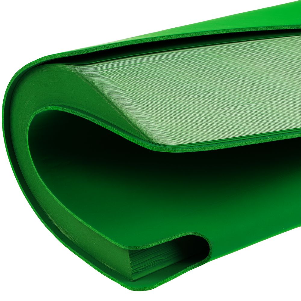 Гибкая обложка выполнена из материала Soft Touch Ultra, зеленый FF. Внутри корешка — специальное место для крепления ручки размером до 15х0,9 см.
