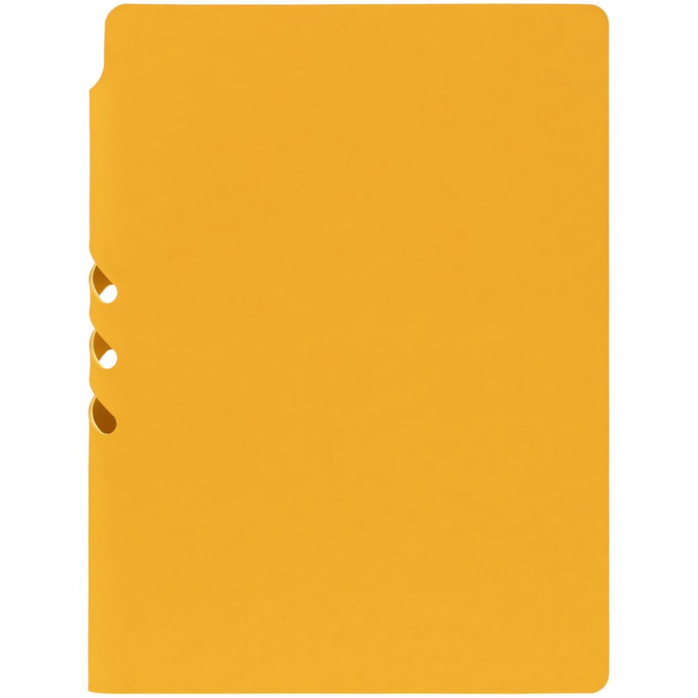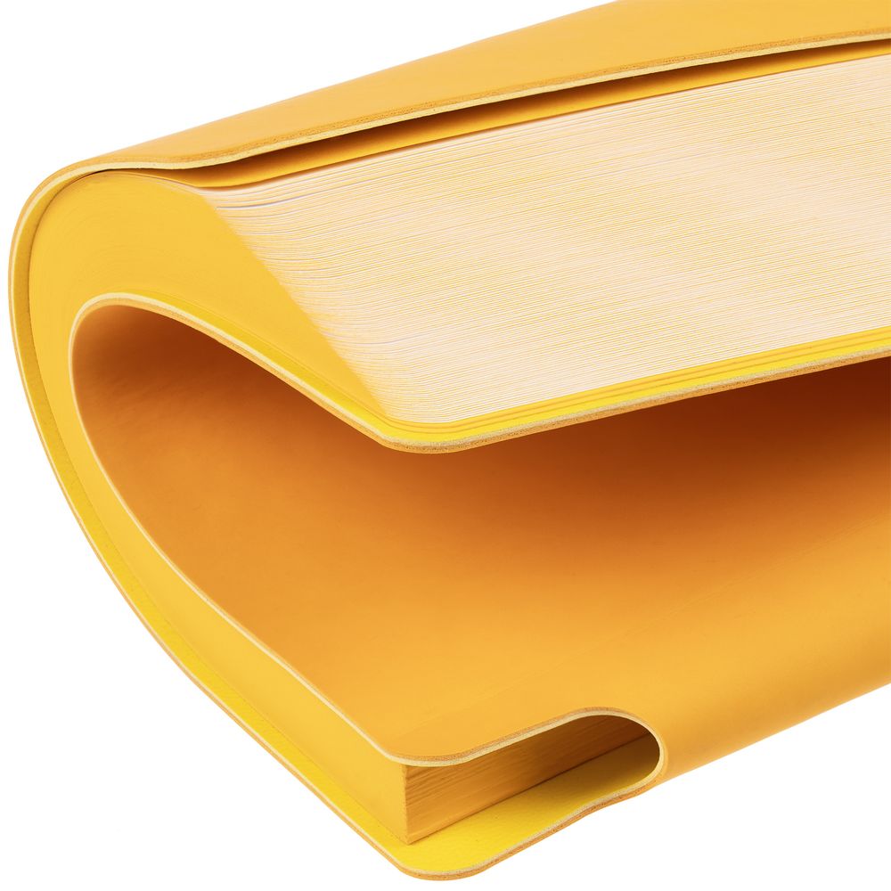 Гибкая обложка выполнена из материала Soft Touch, желтый КК и Latte, желтый КК (внутренняя часть обложки). Внутри корешка — специальное место для крепления ручки размером до 15х1 см.