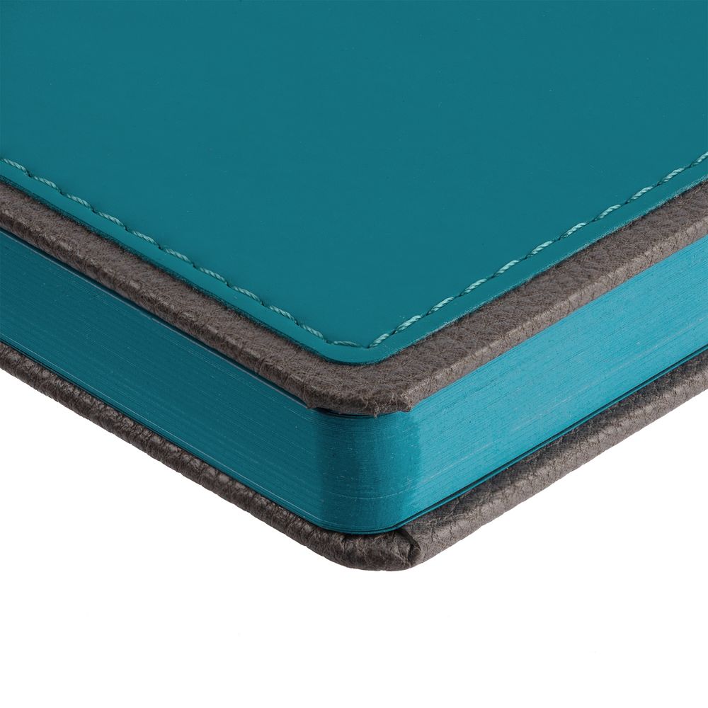 Ежедневник с твердой обложкой, выполнен из материалов Soft Touch, морская волна II и La Fite, серый СС. Ляссе темно-серого цвета.