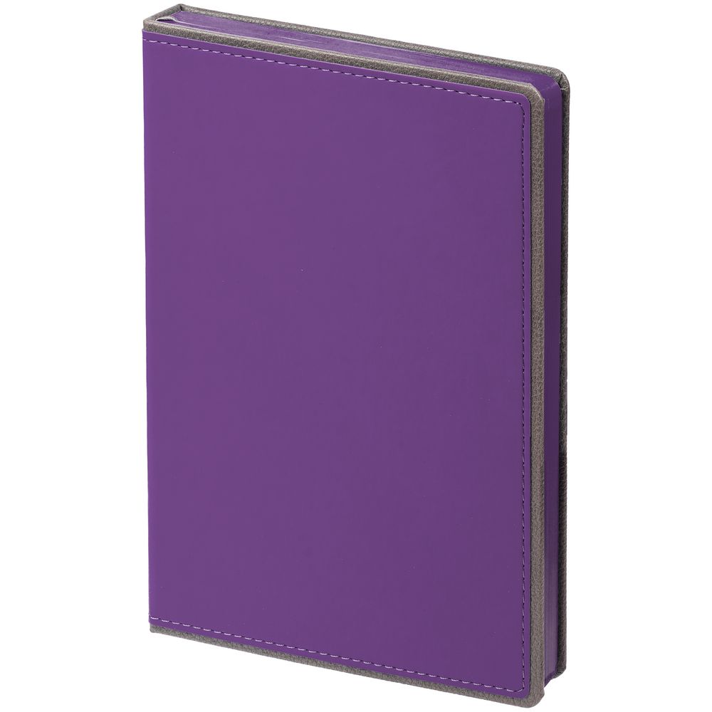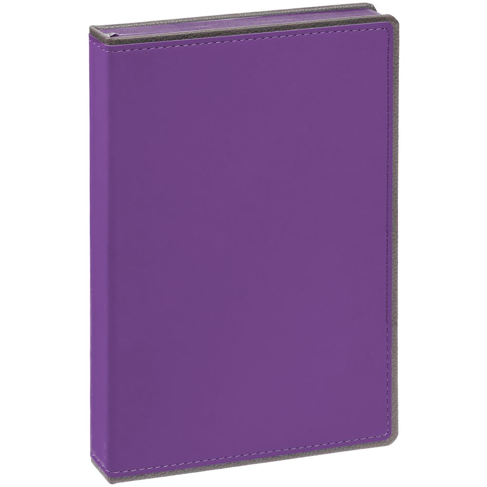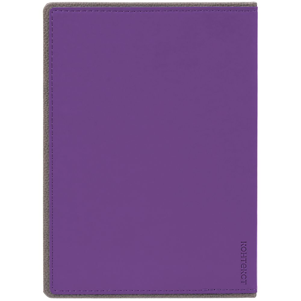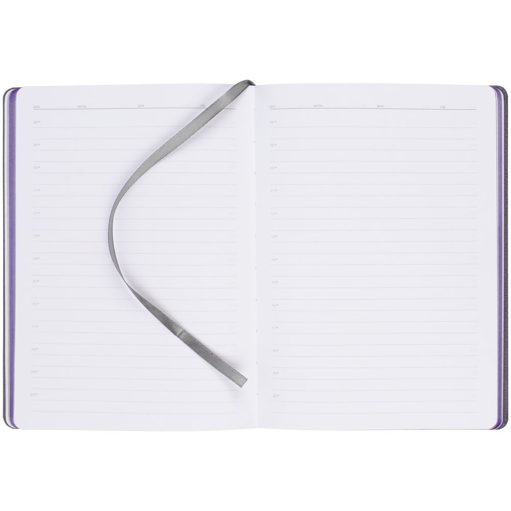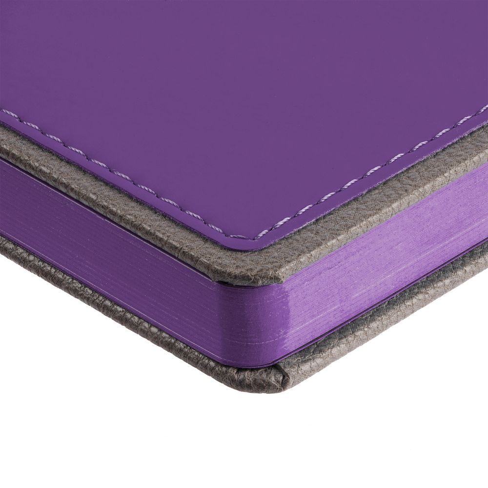 Ежедневник с твердой обложкой, выполнен из материалов Soft Touch, фиолетовый UU и La Fite, серый СС. Ляссе темно-серого цвета.