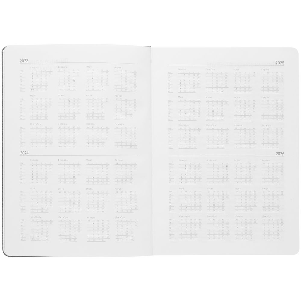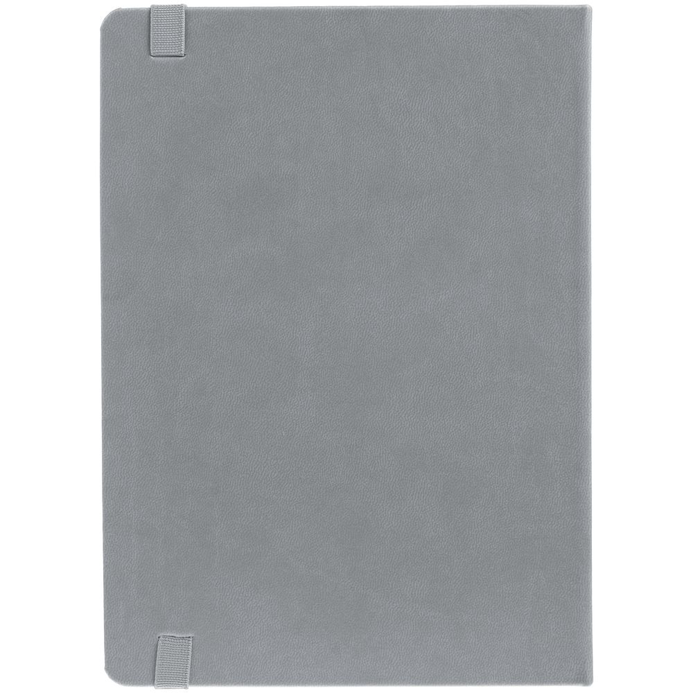 Ежедневник с твердой обложкой, выполнен из материала Latte, серый СС, обрез серого цвета, дополнен ляссе серого цвета и резинкой с металлическим шильдом.