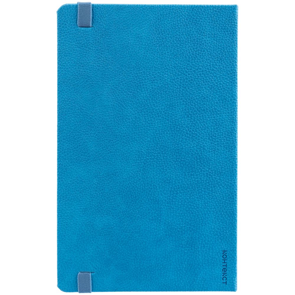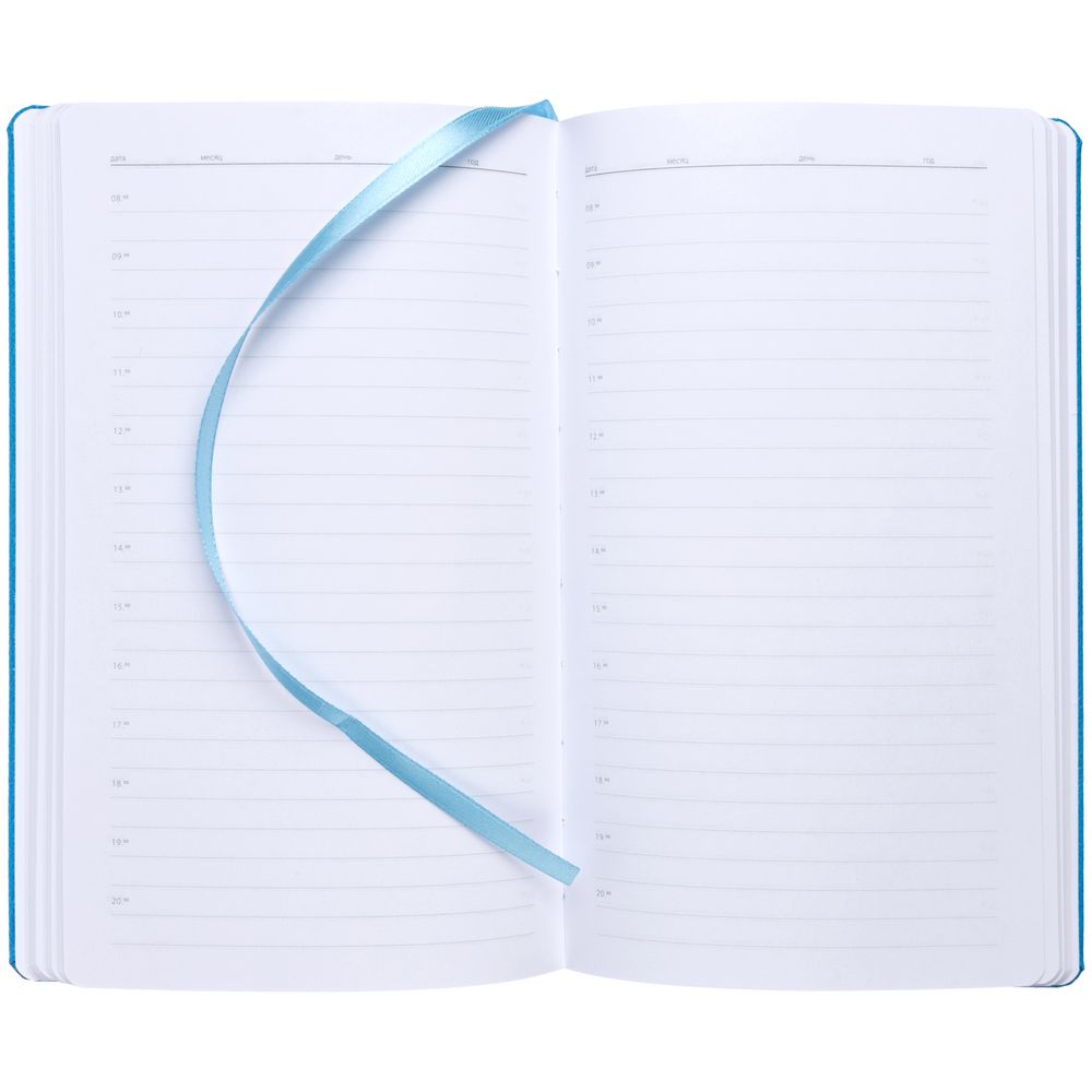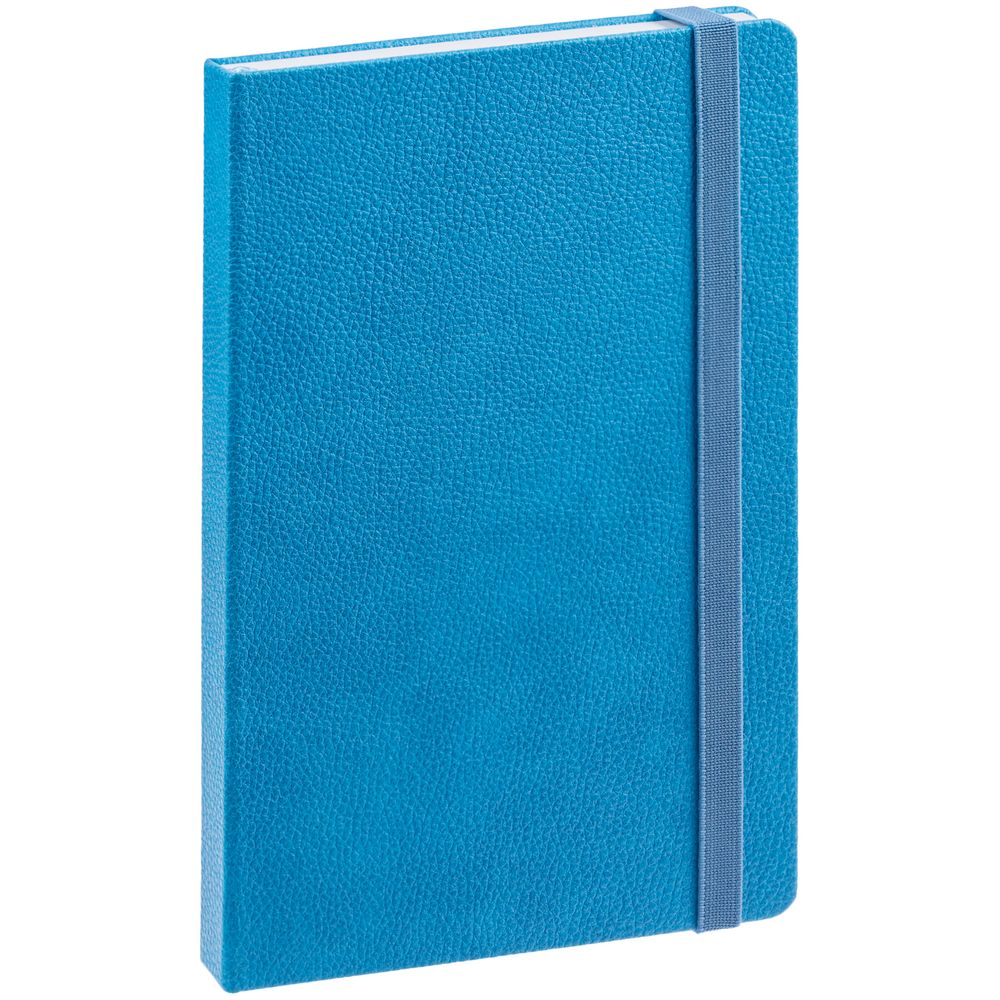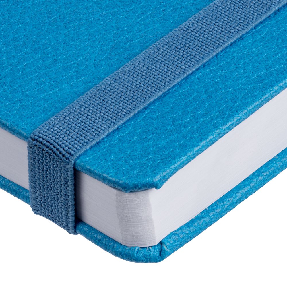 Ежедневник с твердой обложкой, выполнен из материала LaFite, голубой JJ, дополнен резинкой и ляссе в цвет обложки.
