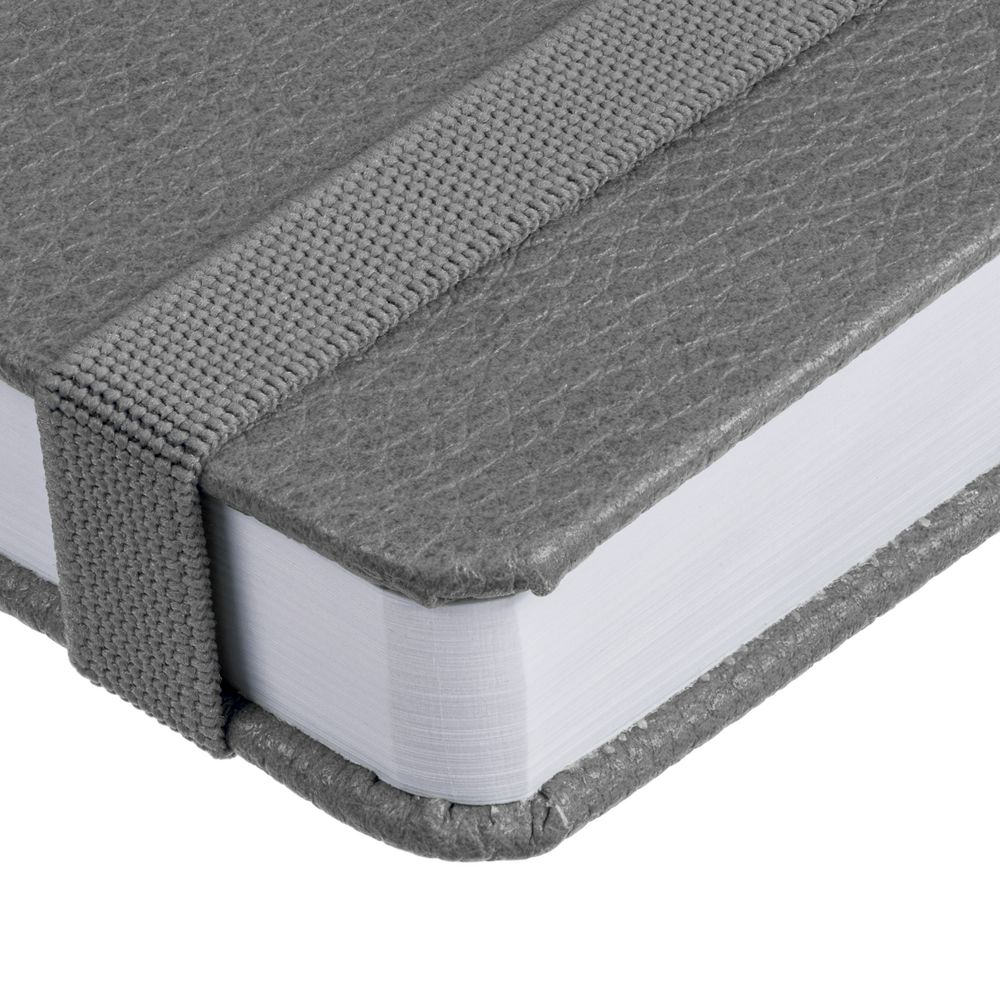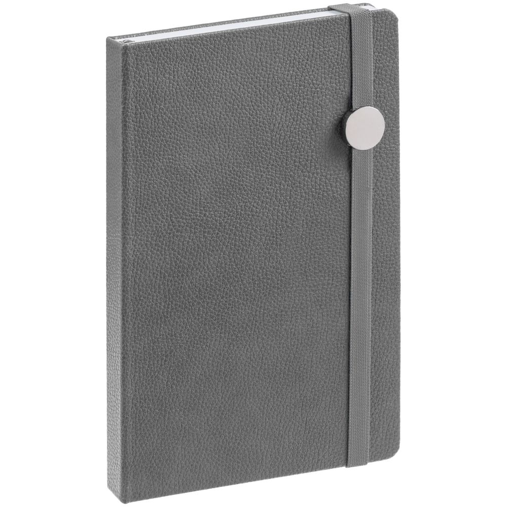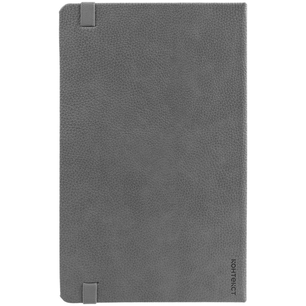Ежедневник с твердой обложкой, выполнен из материала LaFite, серый СС, дополнен резинкой с металлическим круглым шильдом и ляссе в цвет обложки.