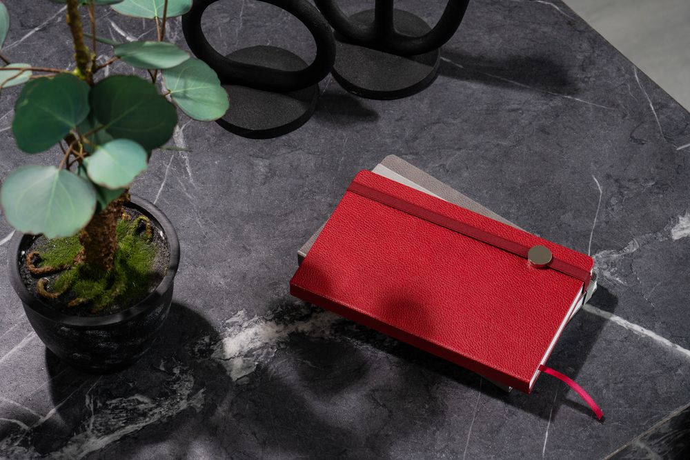 Зауженный ежедневник с круглым металлическим шильдом на резинке.