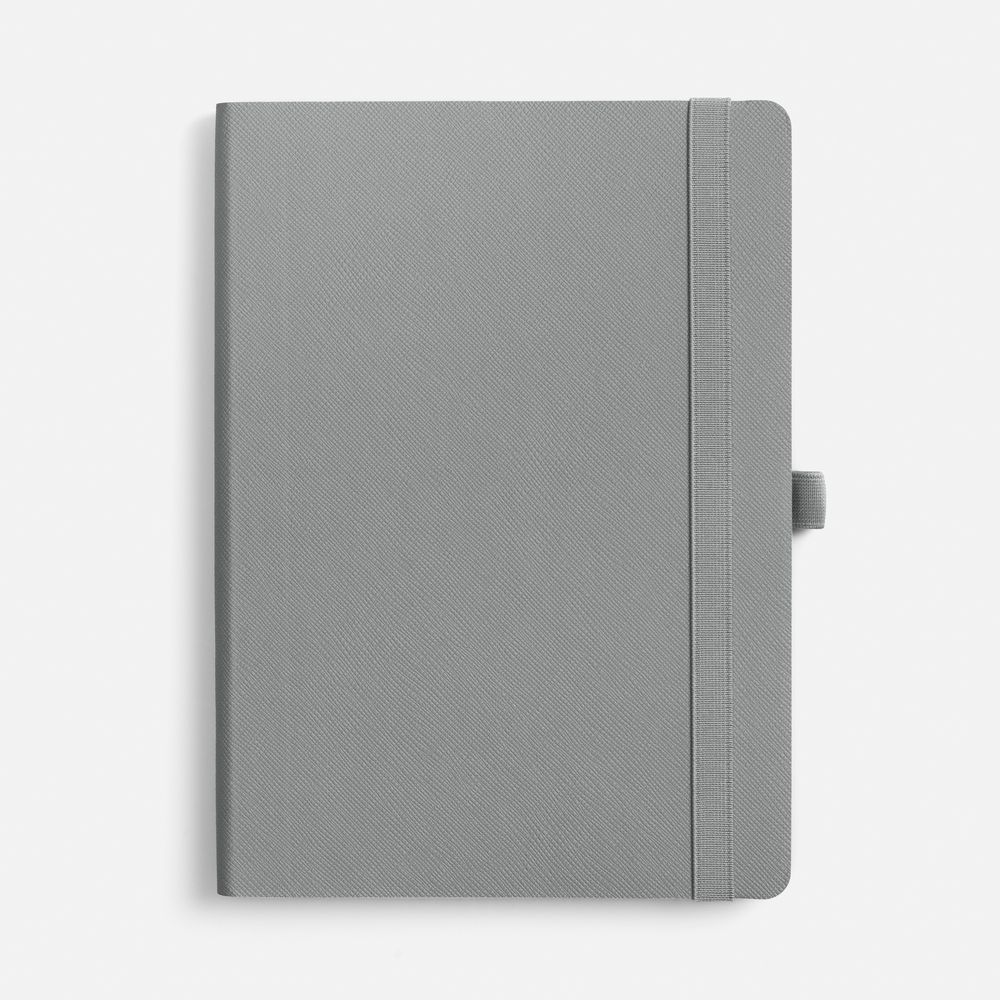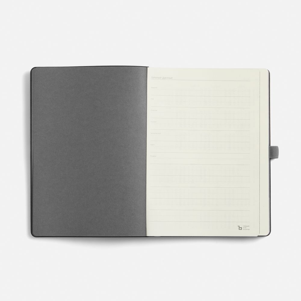 Ежедневник с гибкой обложкой, выполнен из материала Nice Touch, серый СС, дополнен цветными ляссе и петлей-резинкой для ручки.