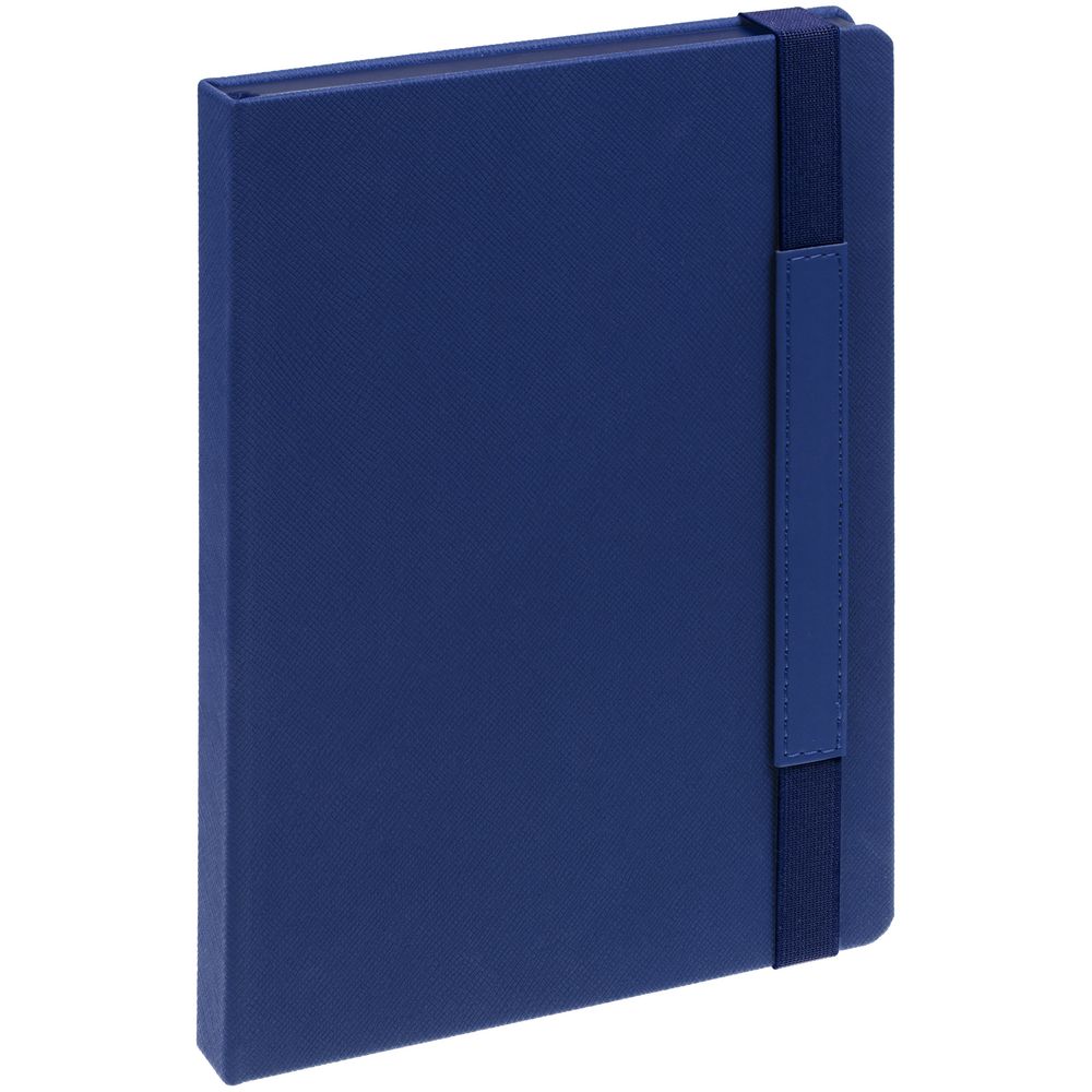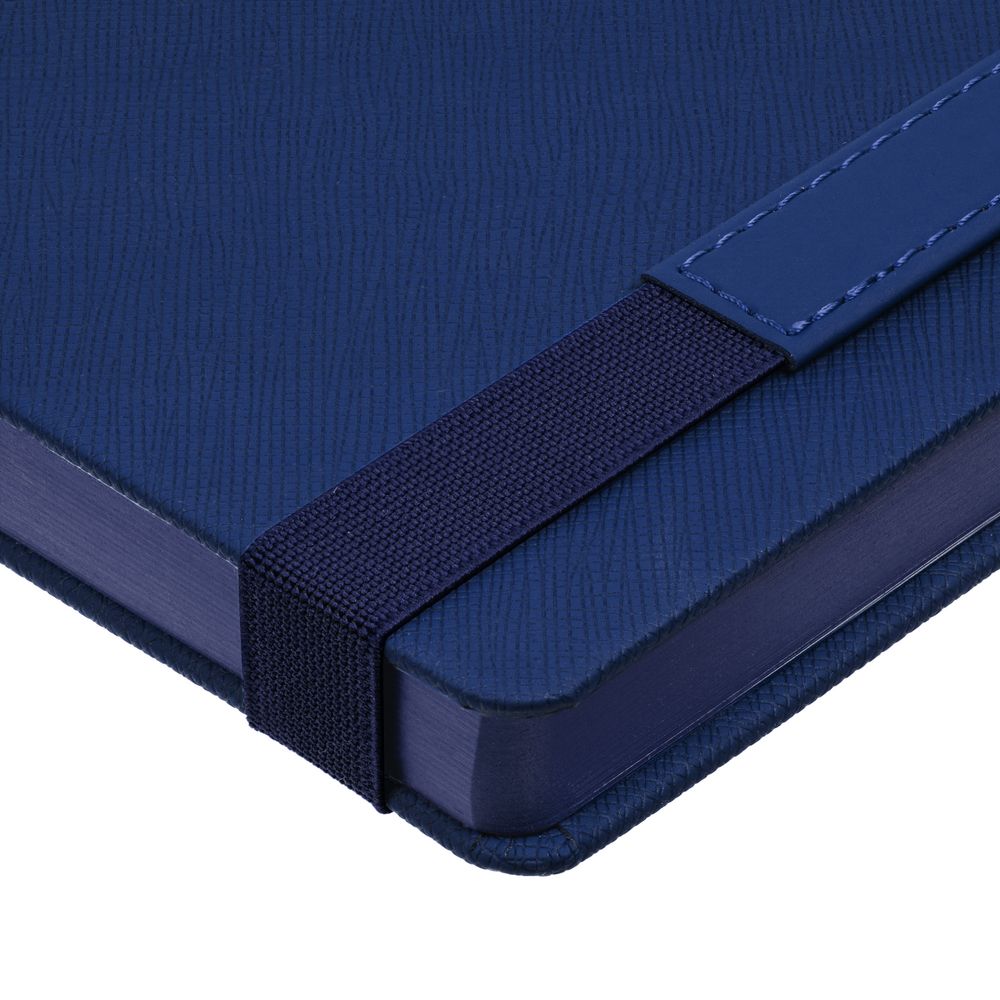 Ежедневник с твердой обложкой, выполнен из материала Nice Touch, синий, дополнен резинкой с лейблом из материала Soft Touch Ultra и ляссе в цвет обложки.