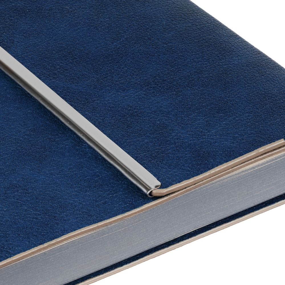 Ежедневник с гибкой обложкой, клапаном на магните и металлической отделкой клапана. Выполнен из материала Petrus, синий НН, дополнен серым ляссе.
