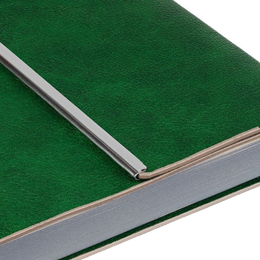 Ежедневник с гибкой обложкой, клапаном на магните и металлической отделкой клапана. Выполнен из материала Petrus, зеленый FF, дополнен серым ляссе.