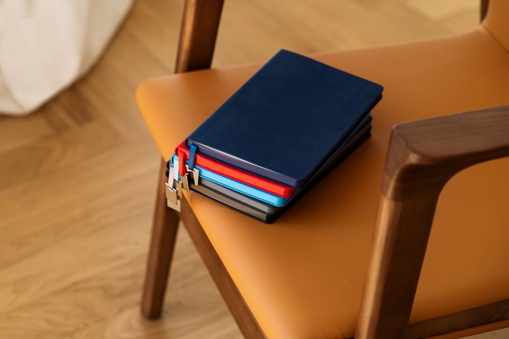 Ежедневник с гибкой обложкой, выполнен из материалов Soft Touch Ultra, голубой JJ, и Latte, голубой (внутренняя часть обложки), дополнен ляссе в цвет обложки с металлическим шильдиком.