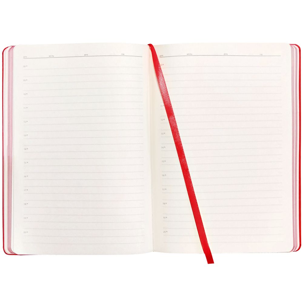 Ежедневник с гибкой обложкой, выполнен из материалов Soft Touch Ultra, красный РР, и Latte, красный (внутренняя часть обложки), дополнен ляссе в цвет обложки с металлическим шильдиком.