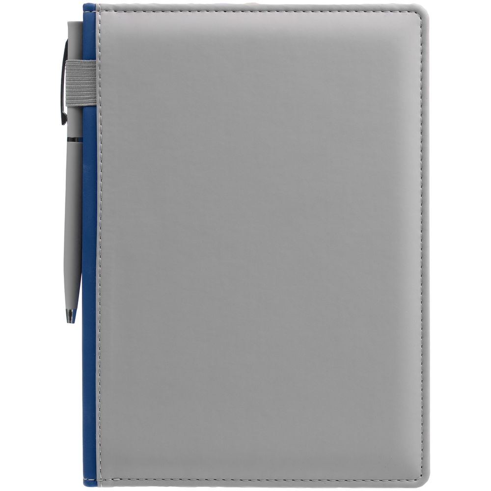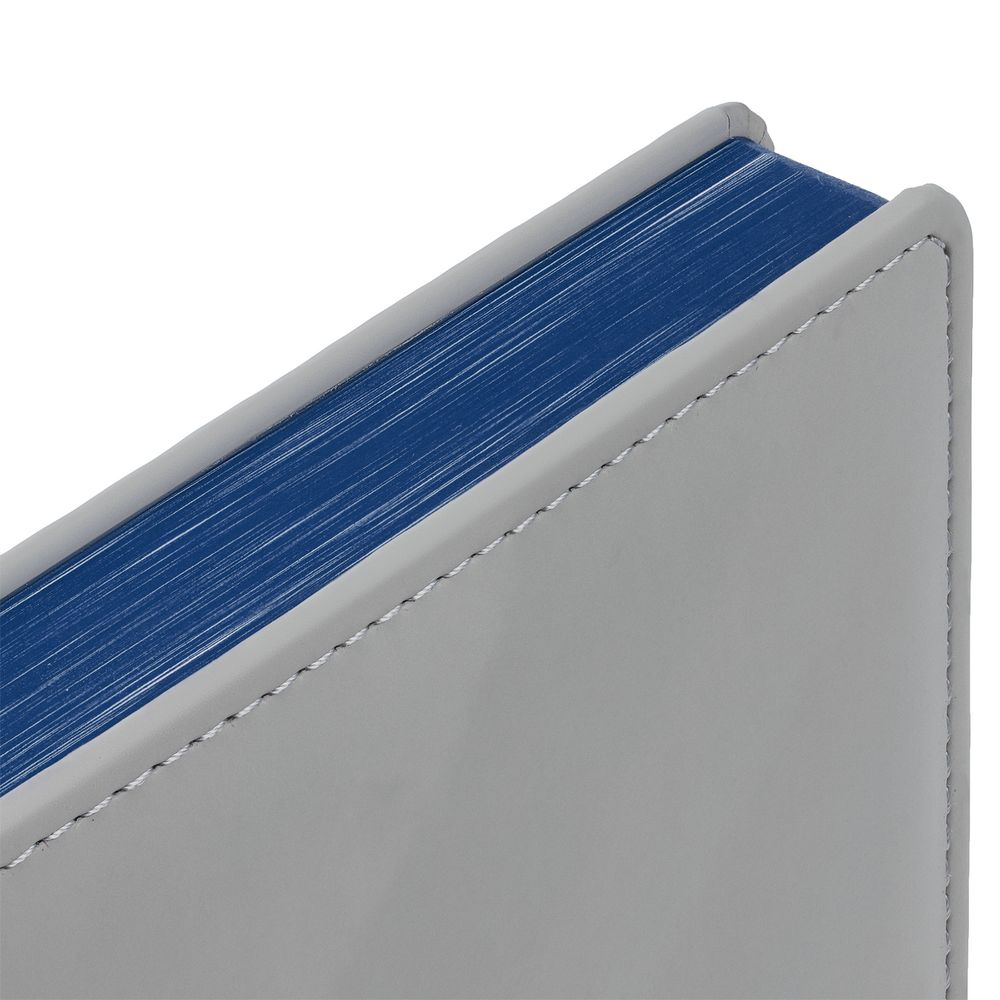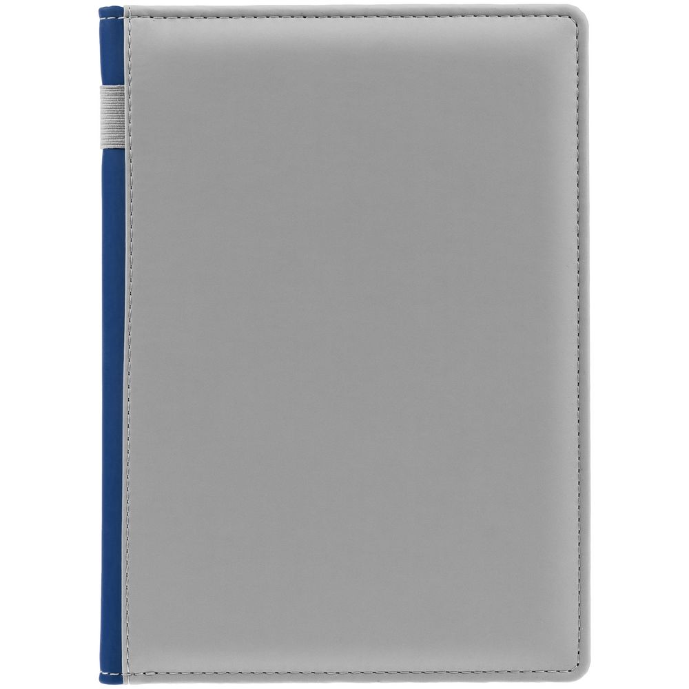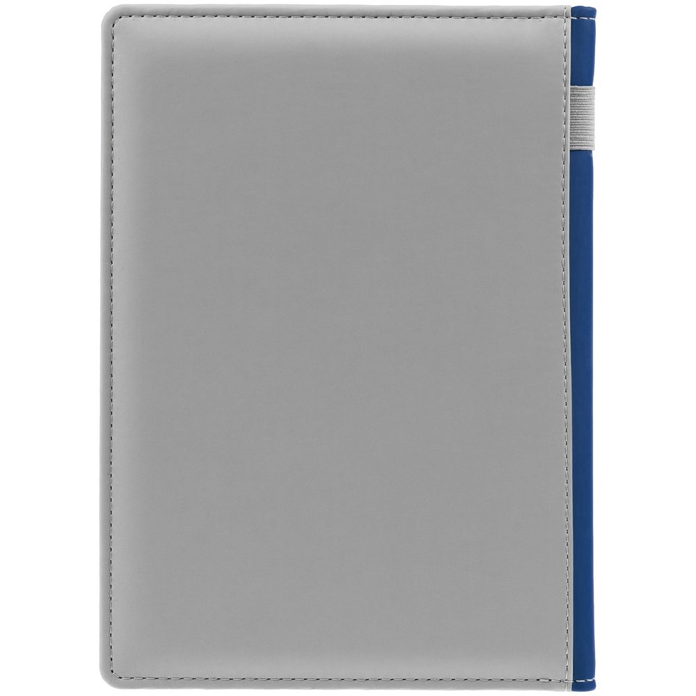 Твердая обложка с поролоном, материал обложки — Soft Touch, серый СС и Soft Touch Ultra, синий НН. На корешке ежедневника находится петля из резинки.