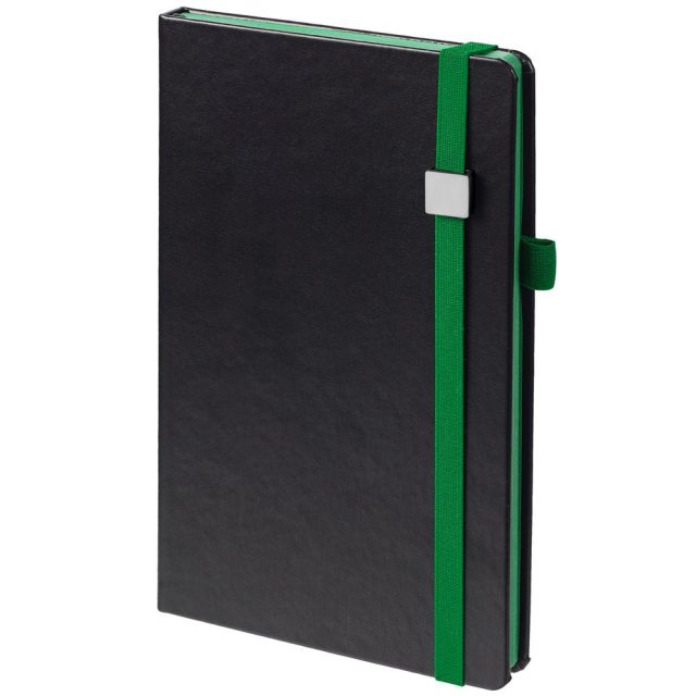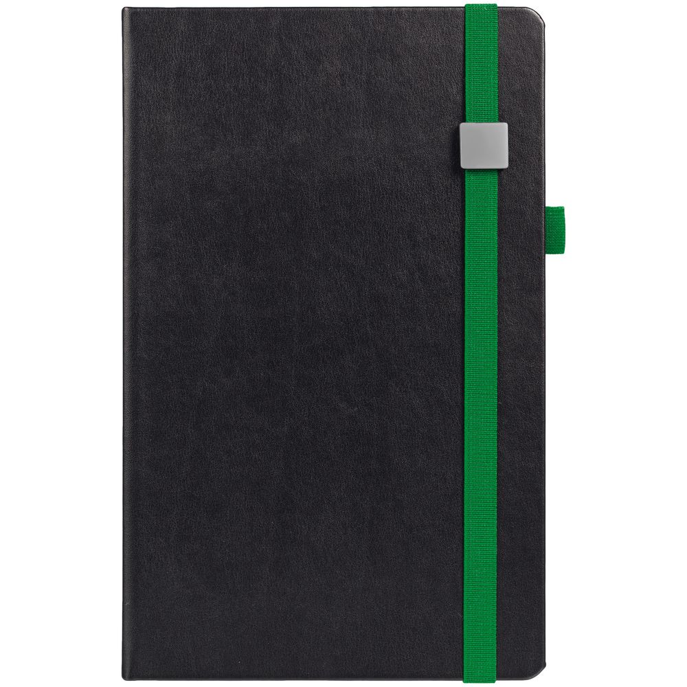 Ежедневник с полутвердой обложкой, выполнен из материала Waltz, черный АА, дополнен зеленой резинкой с металлическим шильдом и ляссе.