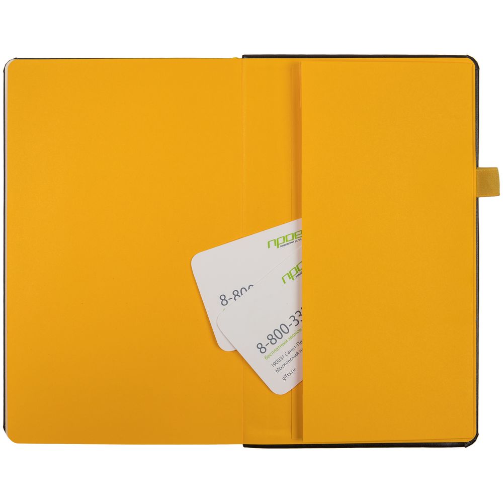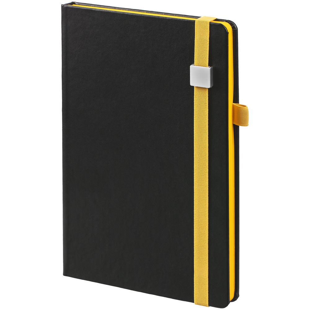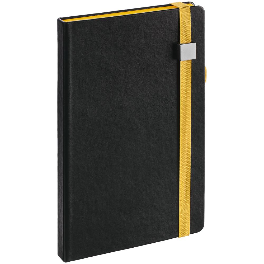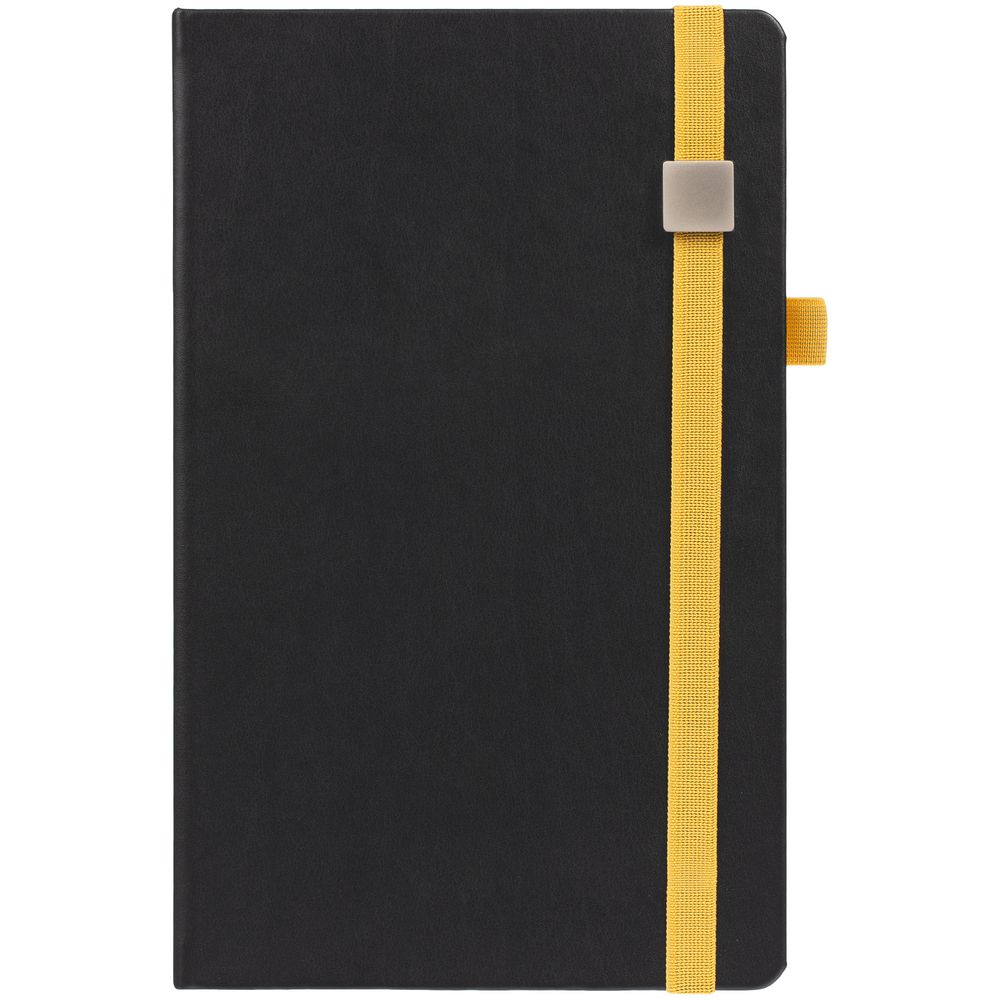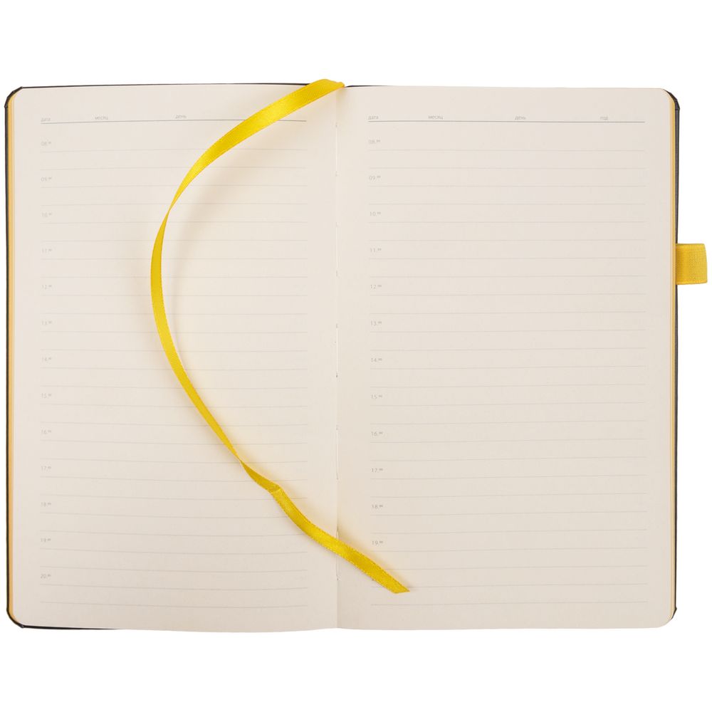 Ежедневник с полутвердой обложкой, выполнен из материала Waltz, черный АА, дополнен желтой резинкой с металлическим шильдом и ляссе.