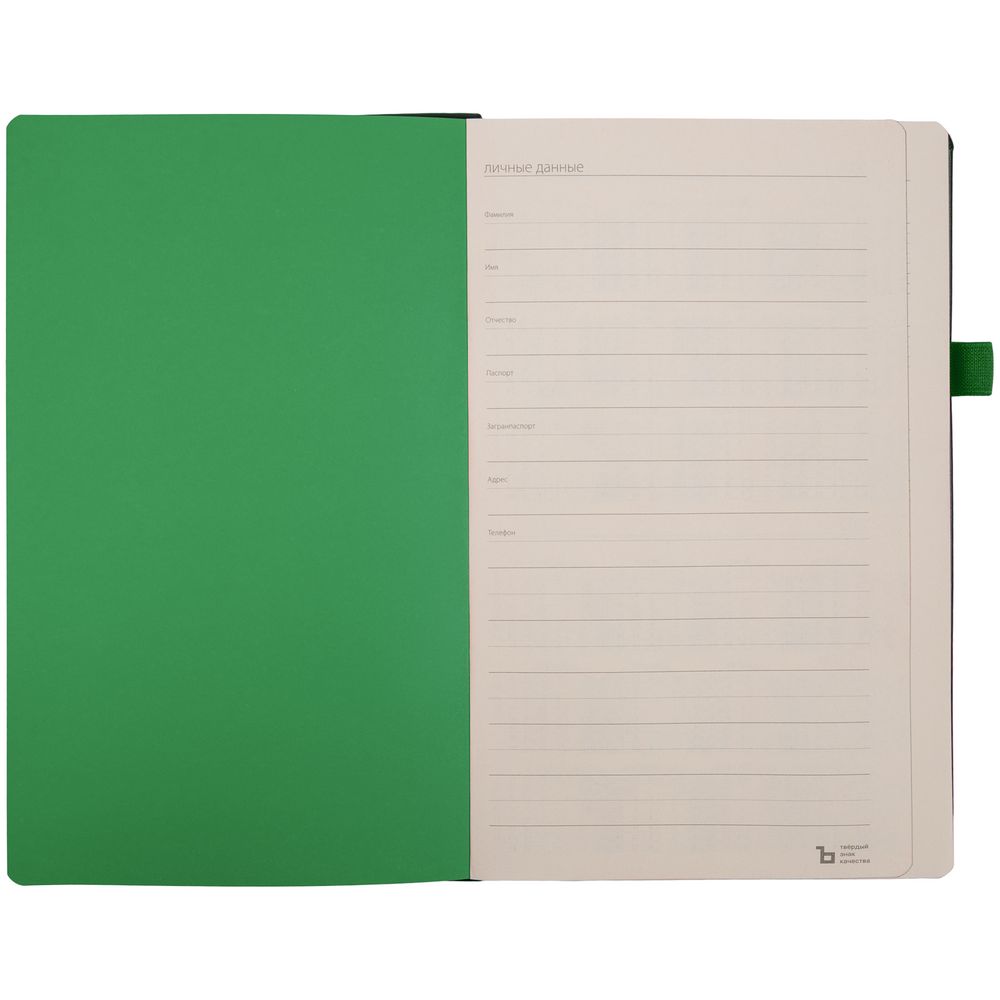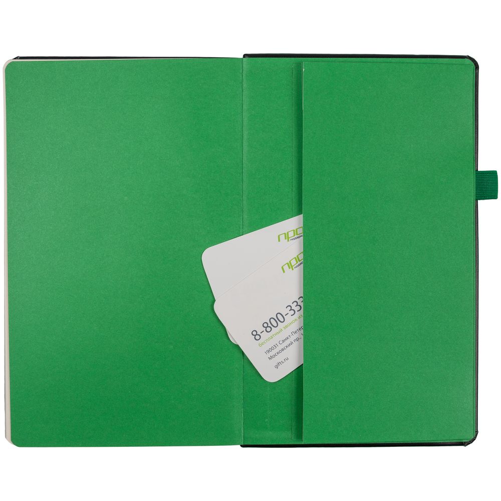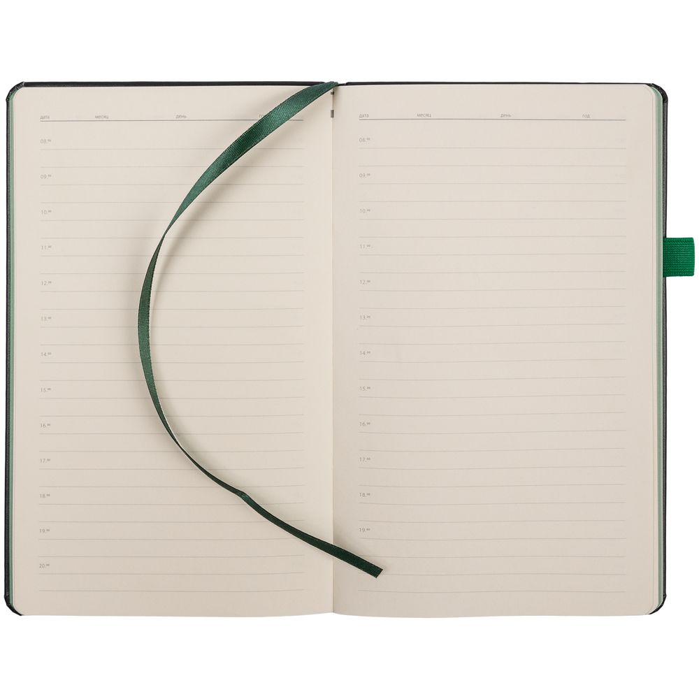 Ежедневник с твердой обложкой, выполнен из материала Waltz, черный АА, дополнен зеленой резинкой и ляссе.