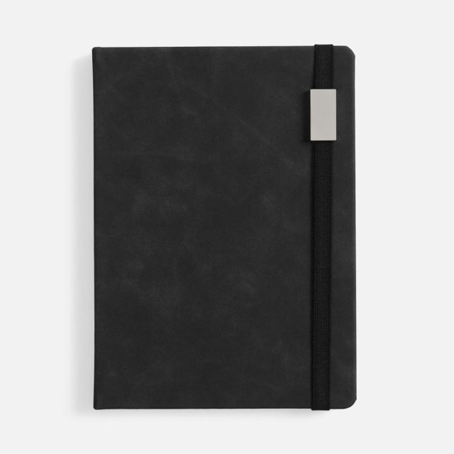 Ежедневник с твердой обложкой, выполнен из материала Nubuck Touch, черный AA, дополнен ляссе в цвет обложки.