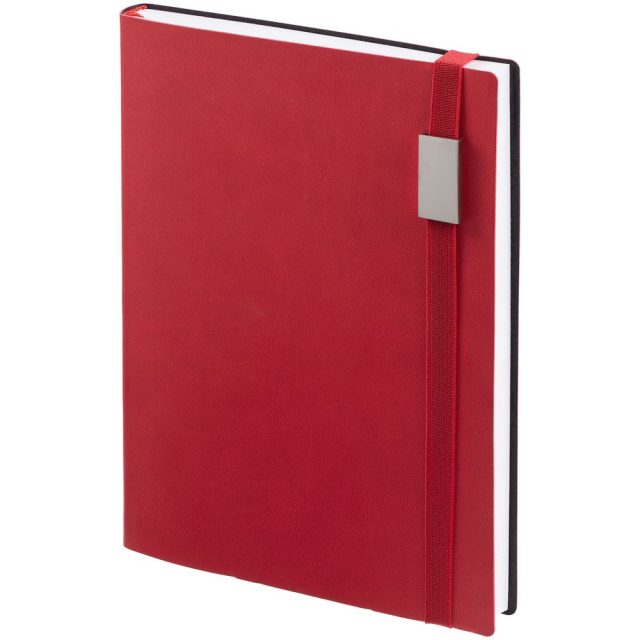 Ежедневник с гибкой обложкой, выполнен из материала Latte, красный PP, дополнен резинкой шириной 1 см с металлическим шильдом, капталом и ляссе красного цвета.