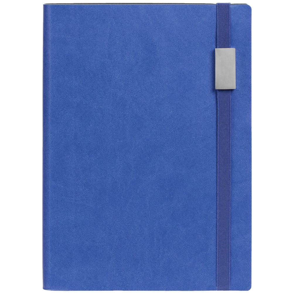 Ежедневник с гибкой обложкой, выполнен из материала Latte, синий НН, дополнен резинкой шириной 1 см с металлическим шильдом, капталом и ляссе синего цвета.