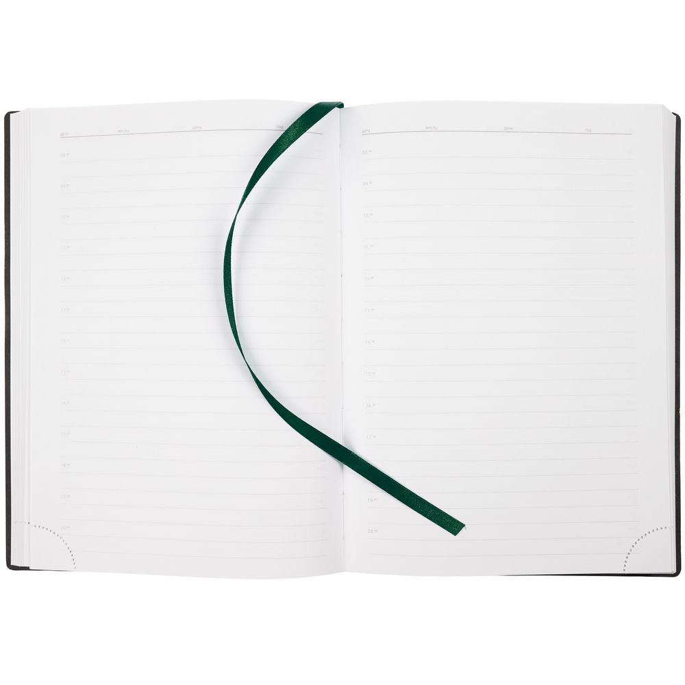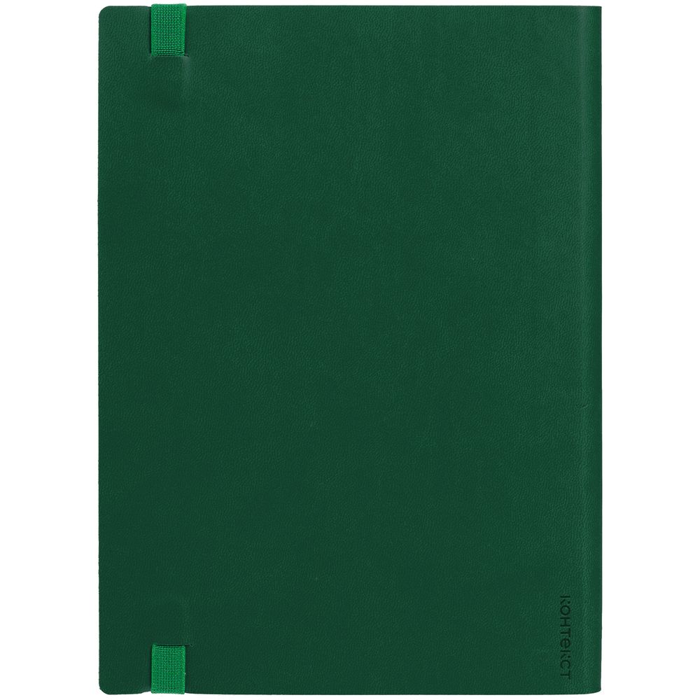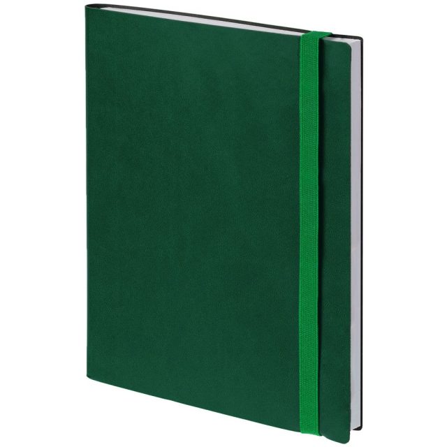 Ежедневник с гибкой обложкой выполнен из материала Latte, зеленый FF, и дополнен резинкой шириной 1 см, капталом и ляссе в цвет обложки.