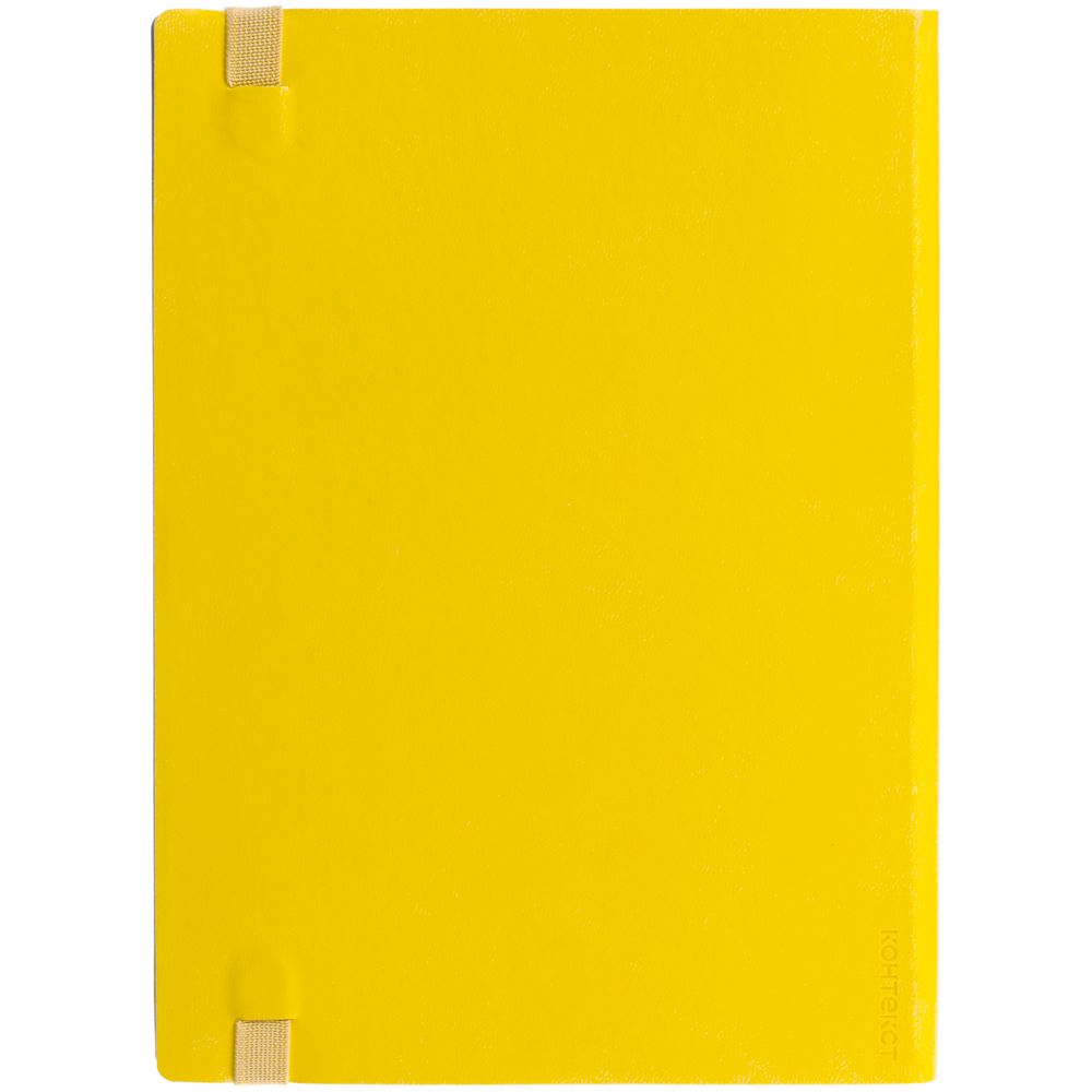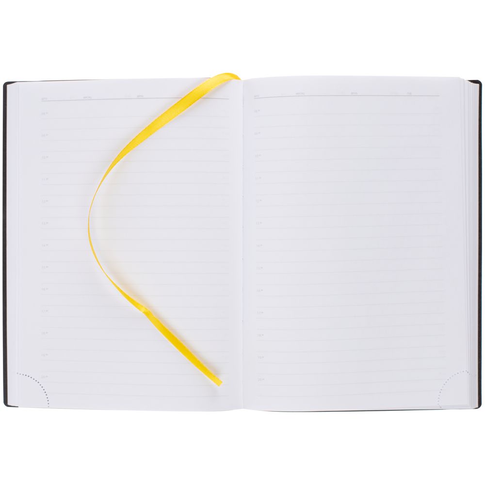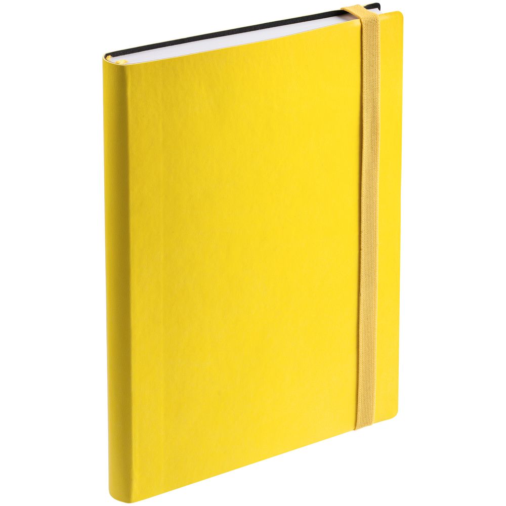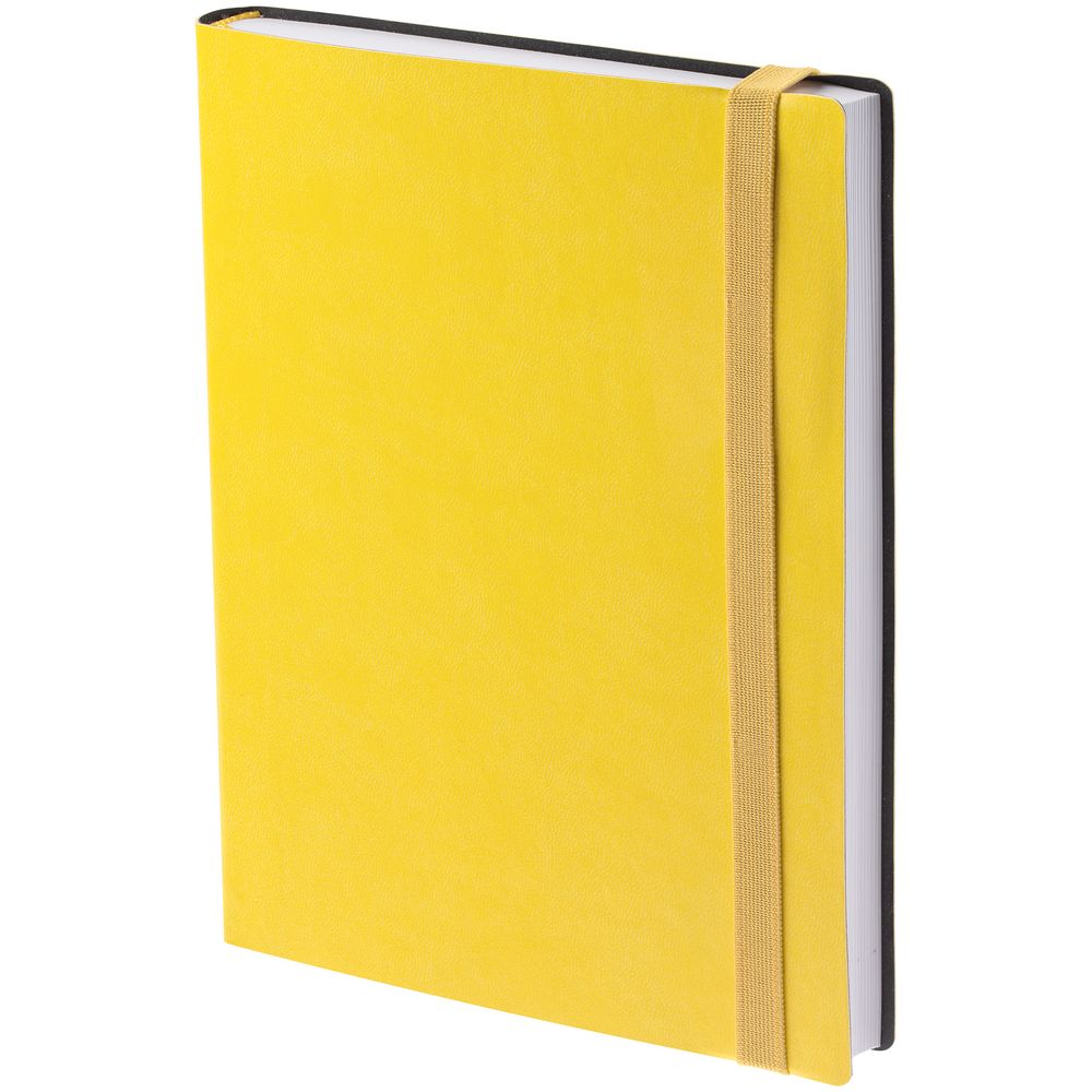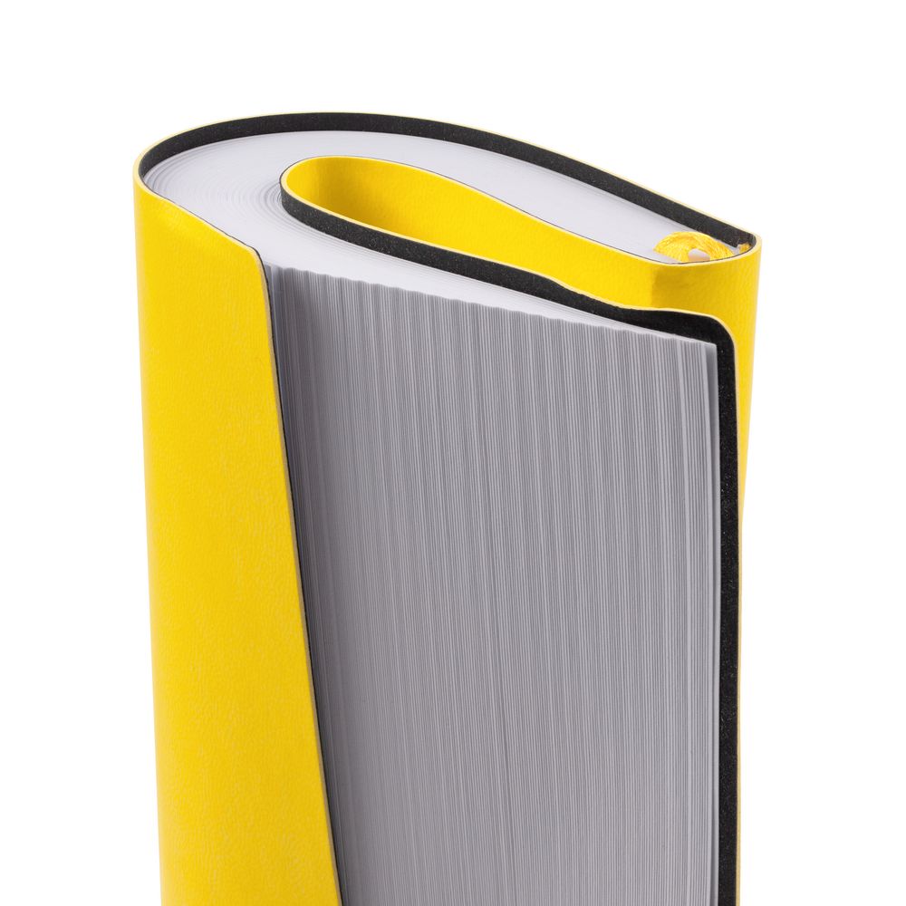 Ежедневник с гибкой обложкой выполнен из материала Latte, желтый КК, и дополнен резинкой шириной 1 см, капталом и ляссе желтого цвета.