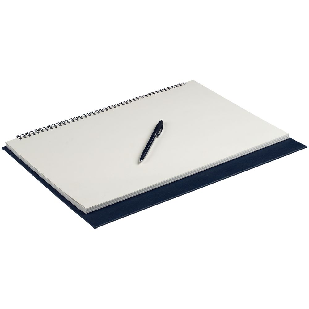 Настольный недатированный планер на открытой пружине. Обложка из белого мелованного картона, подложка из плотного картона в материале Petrus, тёмно-синий XX.