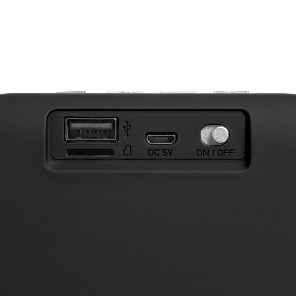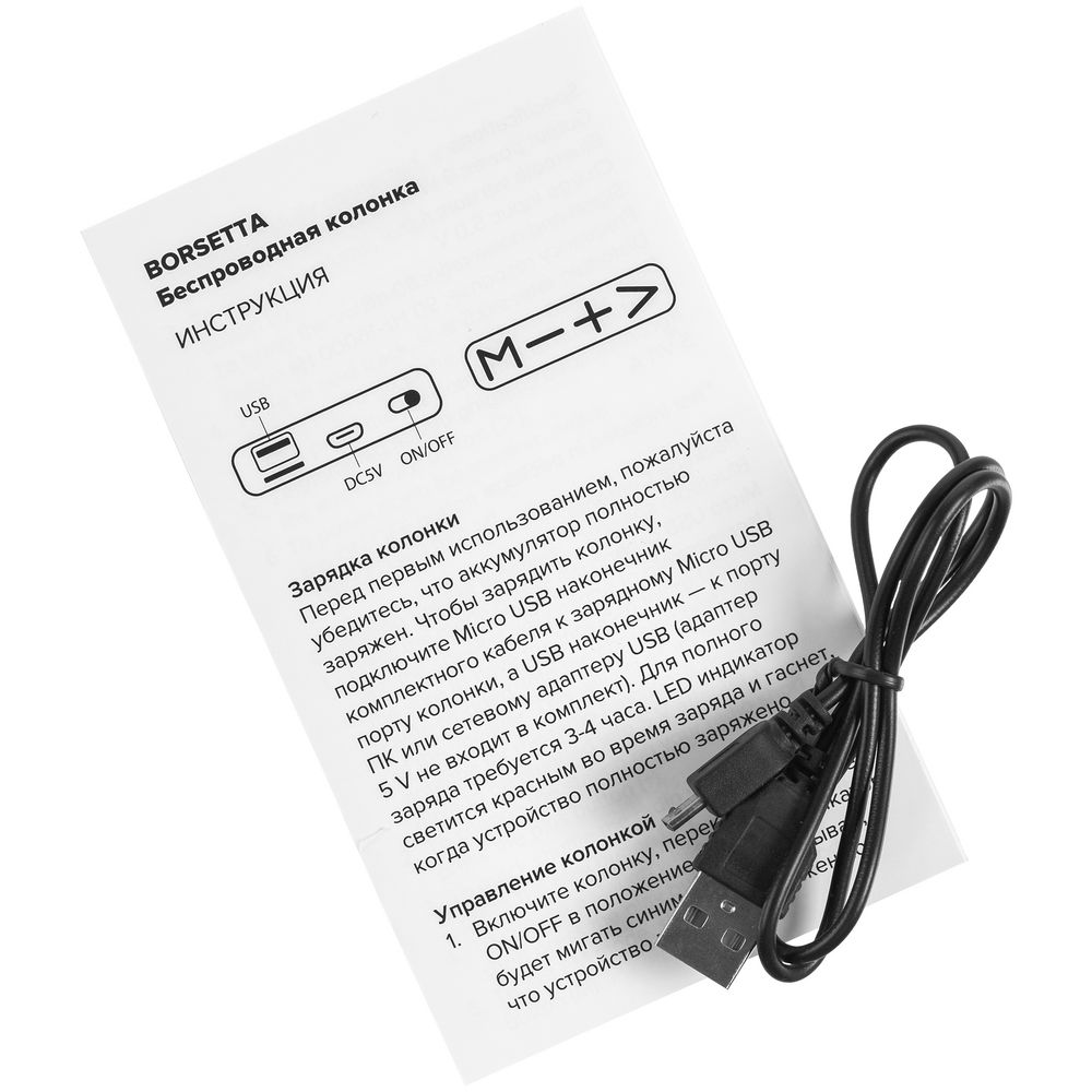 • В комплекте зарядный кабель Micro USB (выполняет функцию FM-антенны при подключении к гнезду колонки; к зарядному устройству при этом подключать не следует)