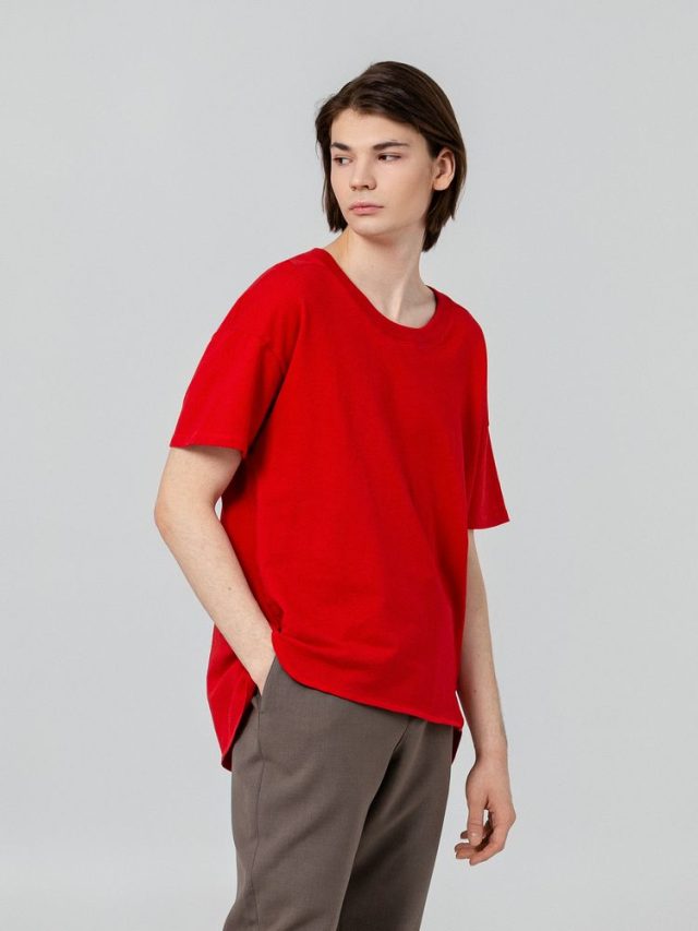 Футболка унисекс свободного кроя со спущенным плечом и смещенными плечевыми и боковыми швами.