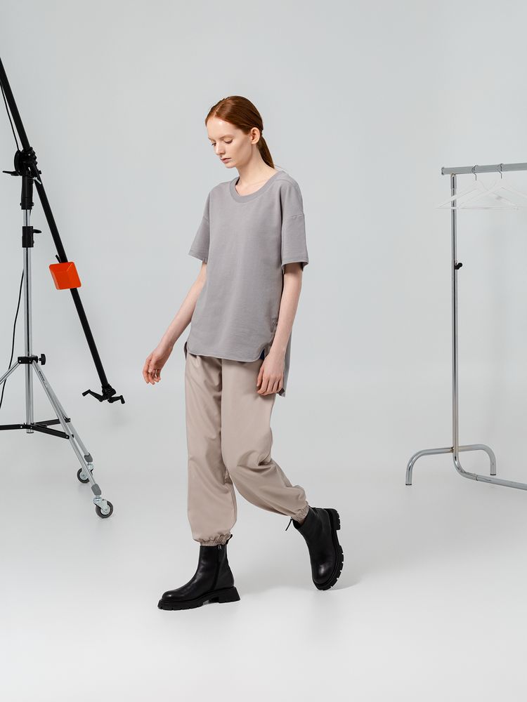 Футболка унисекс свободного кроя со спущенным плечом и смещенными плечевыми и боковыми швами.