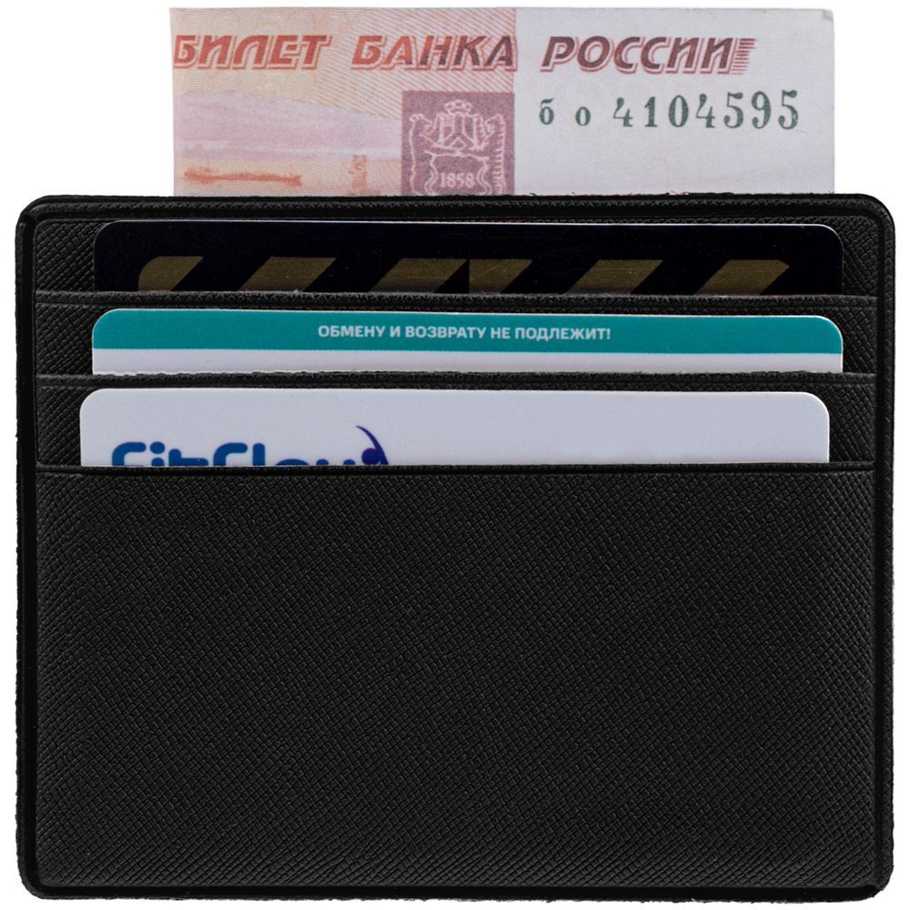 Чехол для карточек из искусственного материала, имитирующего сафьяновую кожу, с шестью отделениями для кредитных карт и одним — для сложенных купюр.