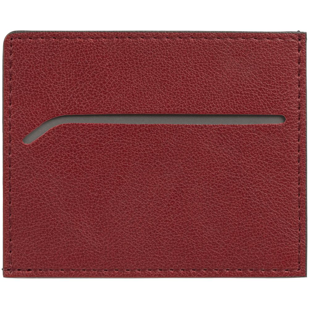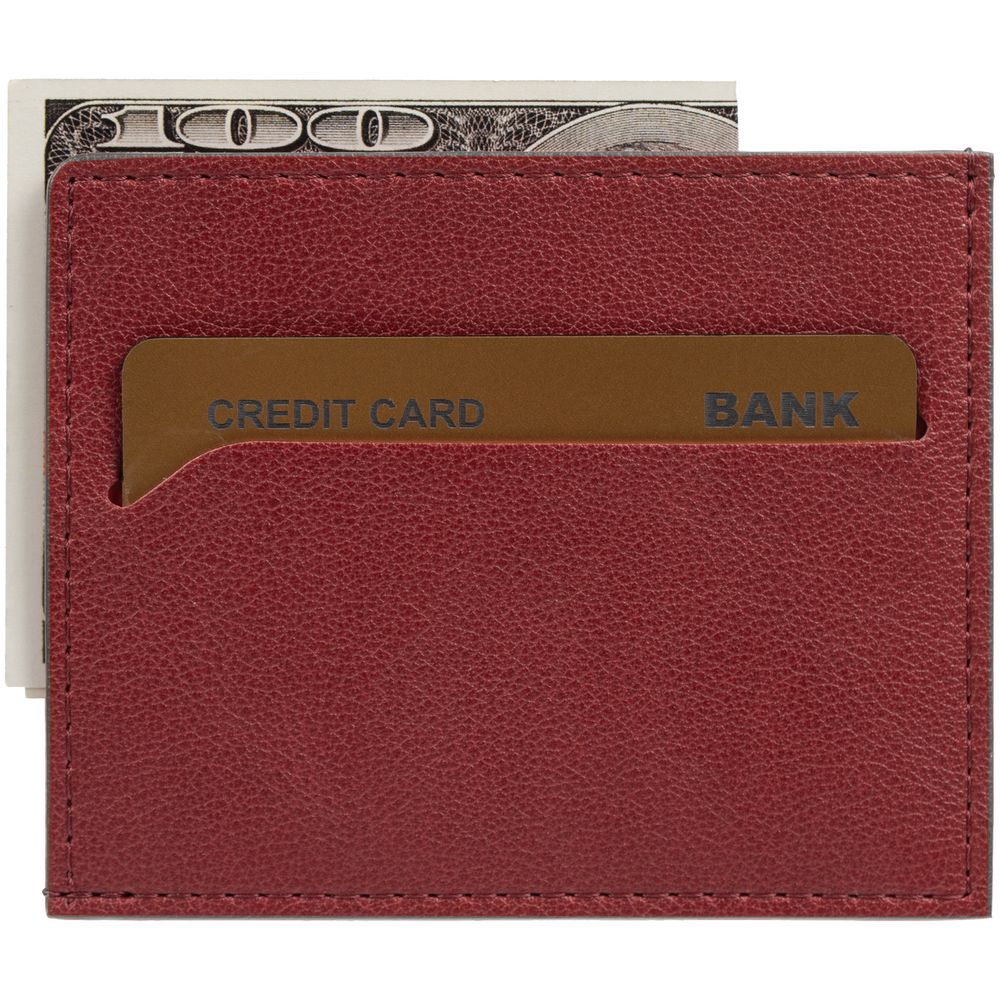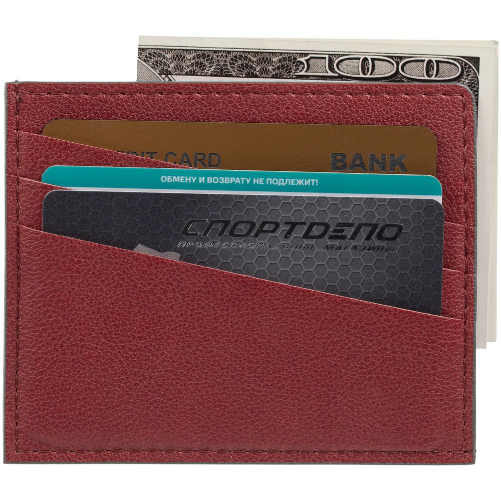Чехол выполнен из материала Petrus, красный РР, дополнен окрашенным срезом края и внутренним карманом из серого картона. Имеет 4 отделения для кредитных карт и 1 отделение для купюр.