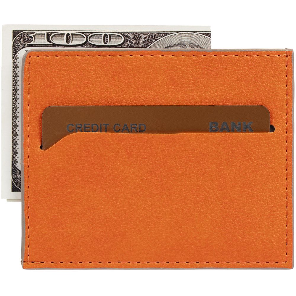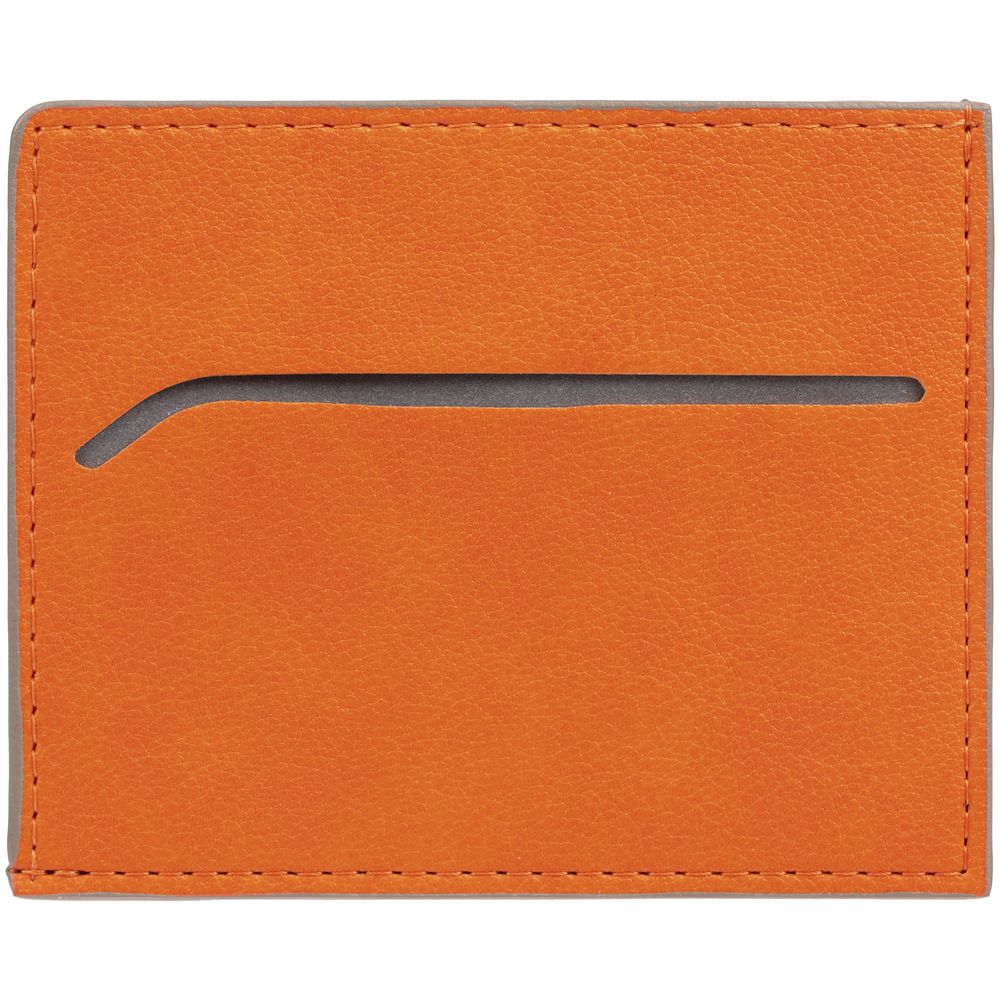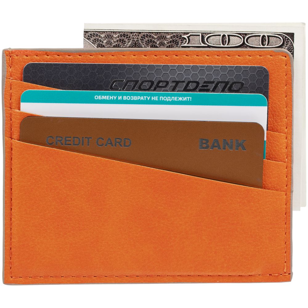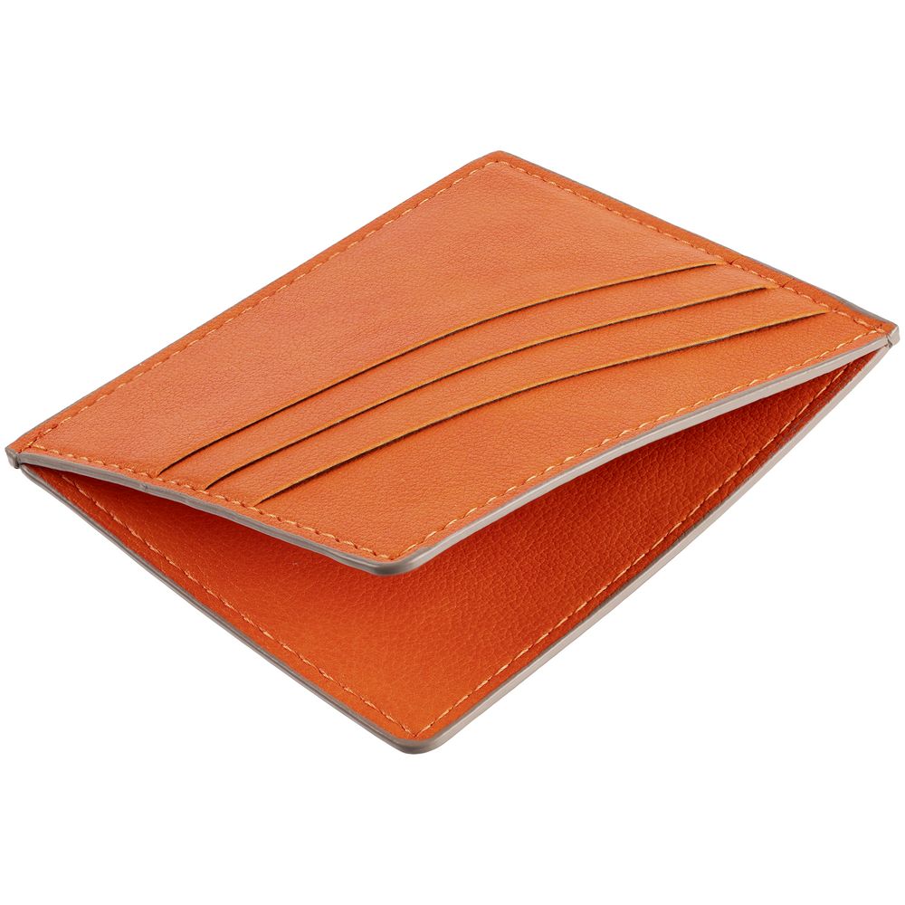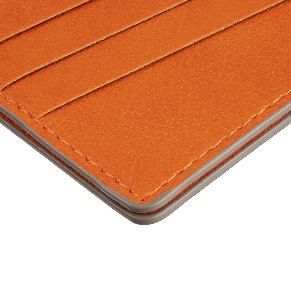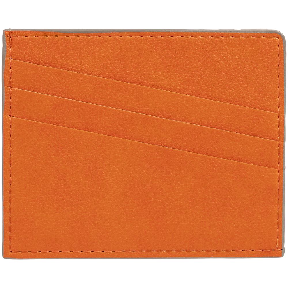 Чехол выполнен из материала Petrus, оранжевый ОО, дополнен окрашенным срезом края и внутренним карманом из серого картона. Имеет 4 отделения для кредитных карт и 1 отделение для купюр.