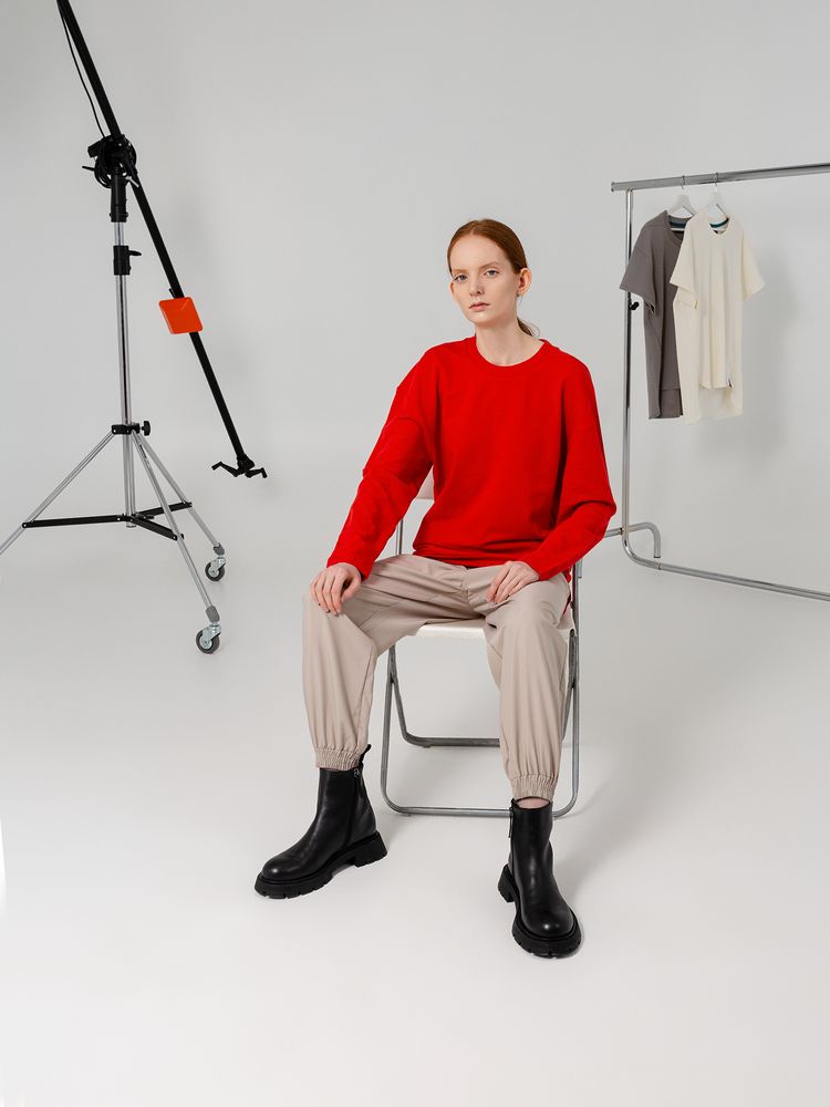 Футболка унисекс с длинным рукавом свободного кроя со спущенным плечом и смещенными плечевыми и боковыми швами.