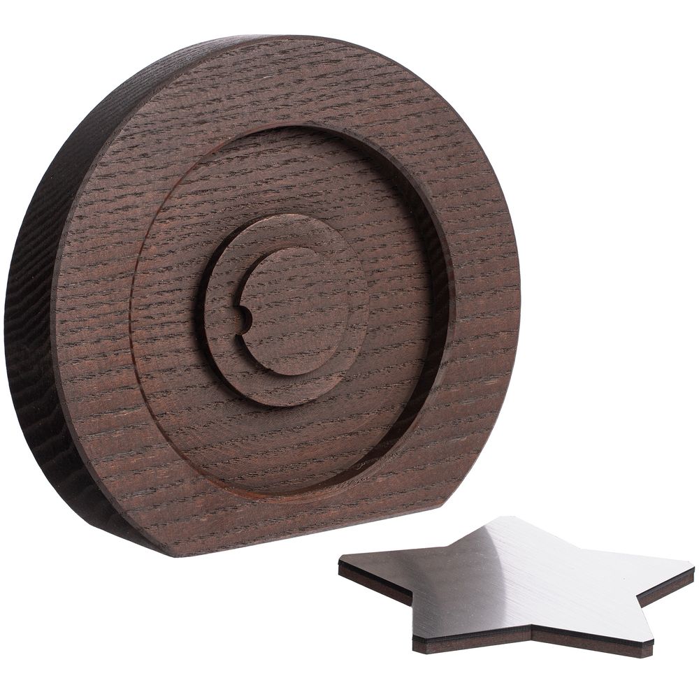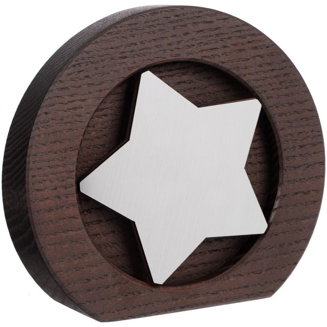 Вставка со звездой из зеркального пластика на деревянной основе крепится на приподнятое основание внутри стелы, что создает объем и многослойность награды. На вставке предусмотрен клеевой слой для крепления после нанесения.