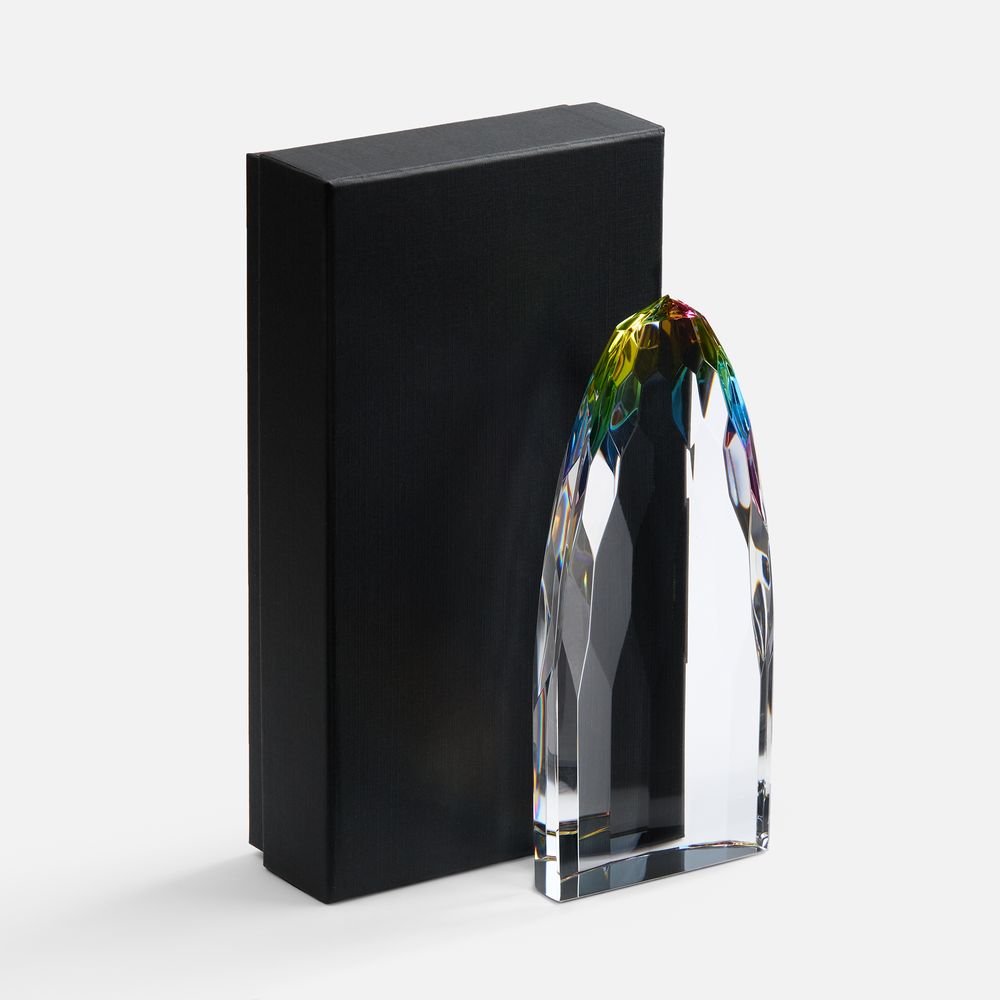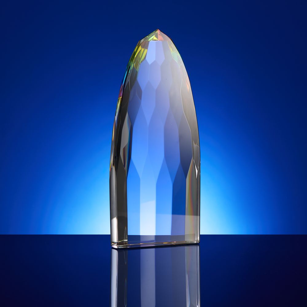 Объемная высокая стела Gleampeak олицетворяет стремление к победам и блестящий успех, свет от которого будет еще долго разливаться вокруг. Необычная форма с легкой огранкой и плавно скошенными краями усиливает визуальный эффект и создает притягательные отблески по всей стеле — она словно светится изнутри! Такое разноцветное свечение — яркий символ творческого подхода, который окрасит в разные оттенки любое дело.