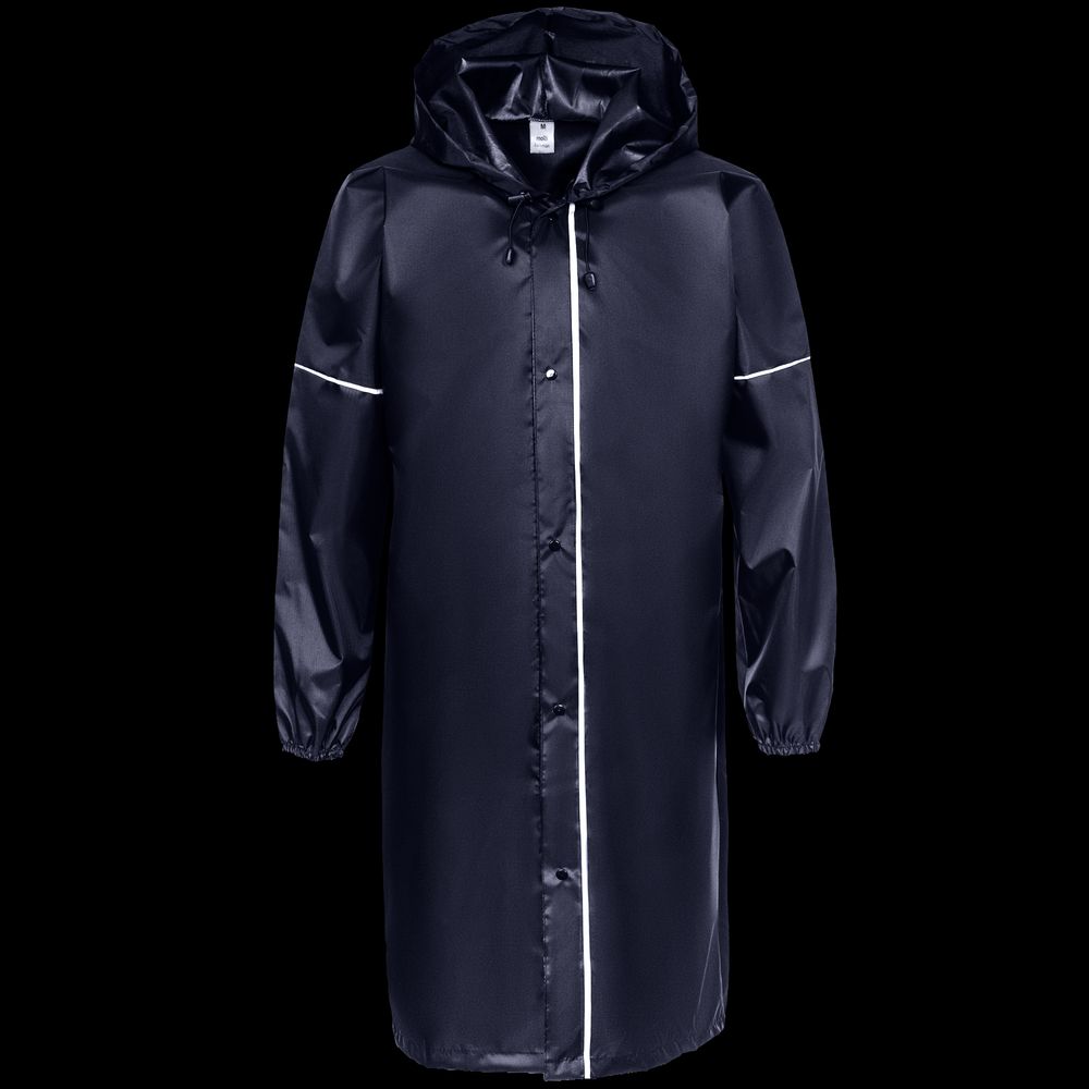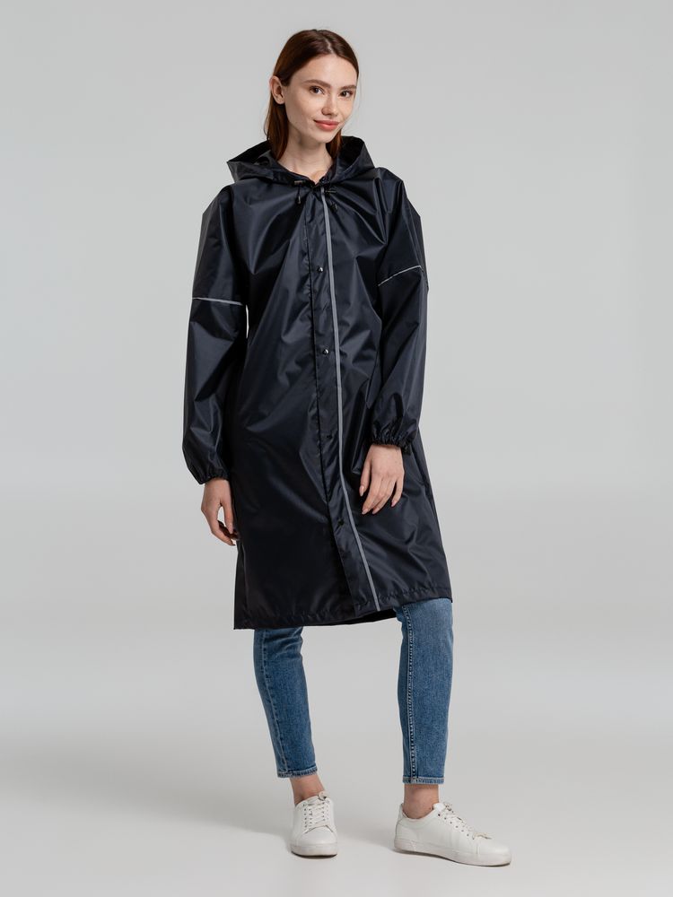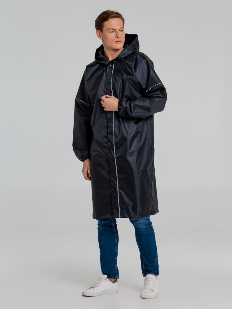 Плащ-дождевик из ткани оксфорд на кнопках с капюшоном. Световозвращающие элементы на рукавах и планке позволяют быть замеченным в темное время суток.