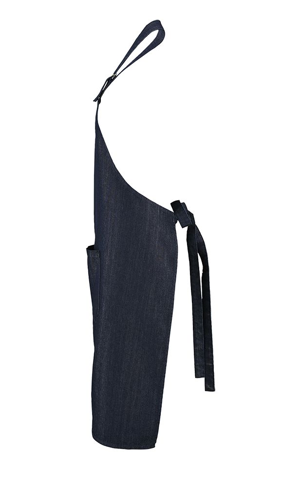 Стильный фартук из сырого денима с большими карманами спереди и регулируемой лямкой.