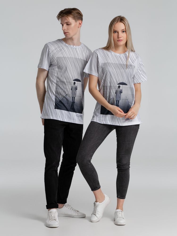 Затяжной ливень заполняет собой все пространство длинными линиями, словно строчки стихов белые страницы. Дождь — это поэзия природы. Футболка с эпиграфом.Футболка унисекс оверсайз. Окантовка горловины из основного полотна.