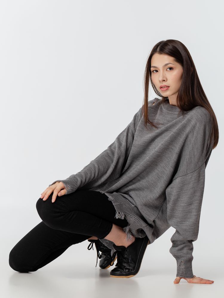 Оверсайз джемпер с круглым вырезом и рваными краями. Ворот, манжеты и низ изделия выполнены резинкой.