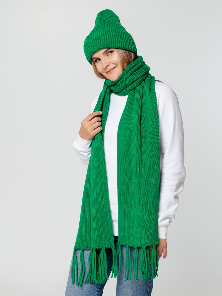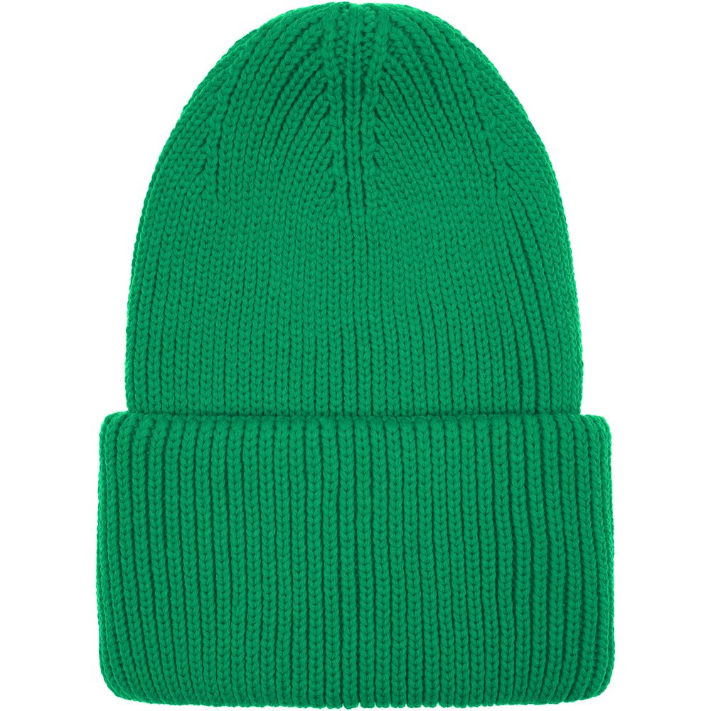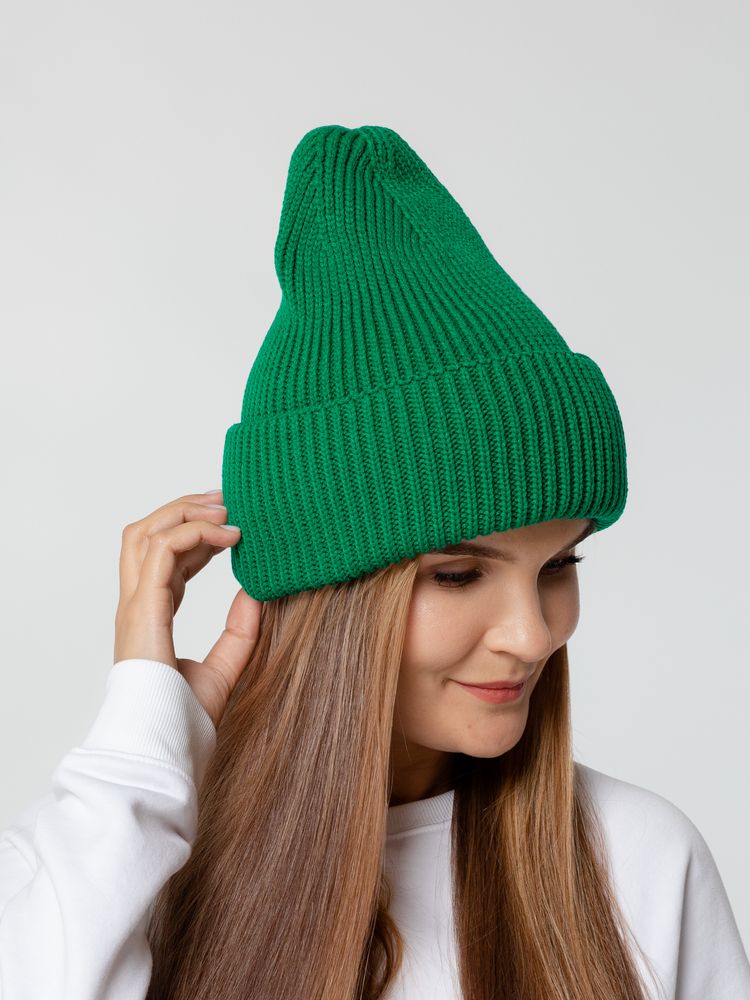 Удлиненная шапка объемной фактурной вязки с отворотом.