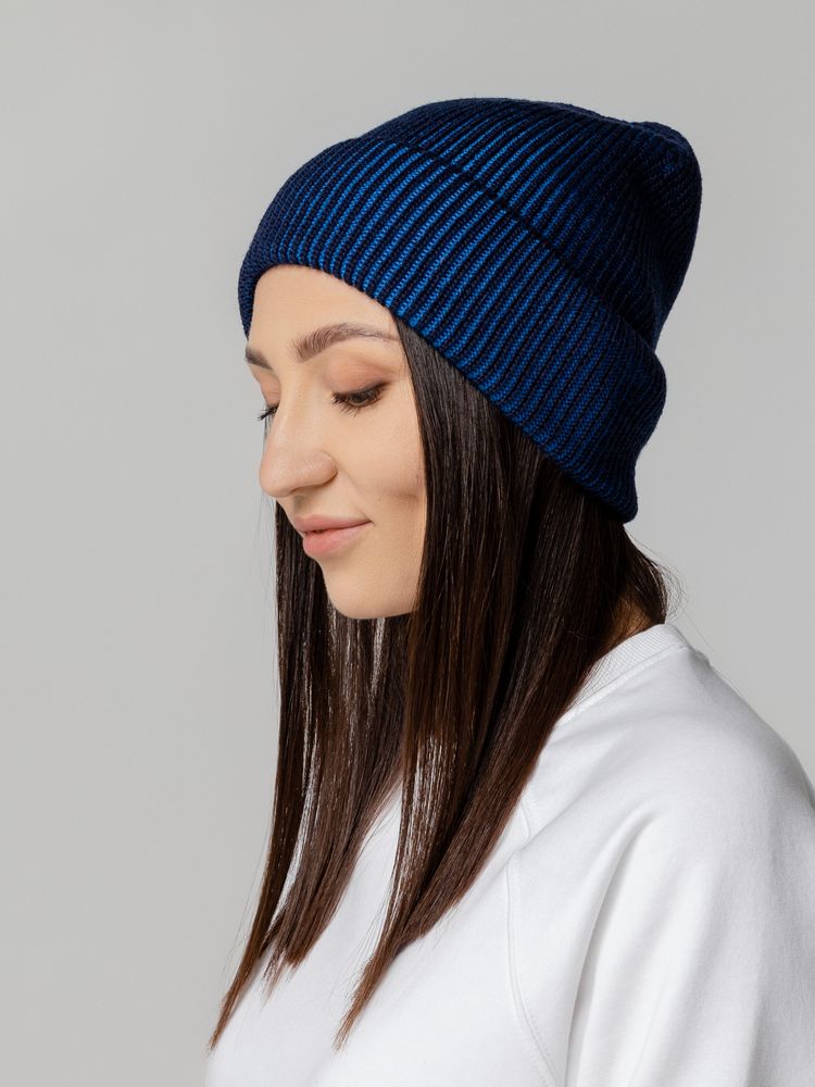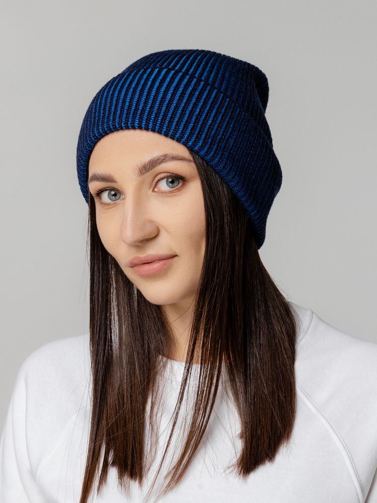Удлиненная двухцветная шапка из полушерстяной пряжи идеально подходит для создания яркого и современного городского образа и будет удачно смотреться с верхней одеждой разных стилей.